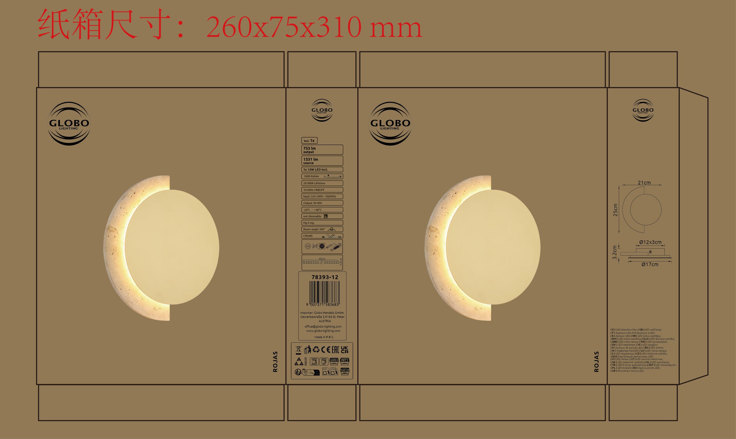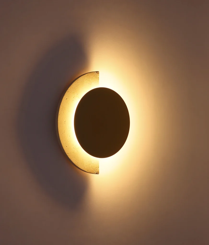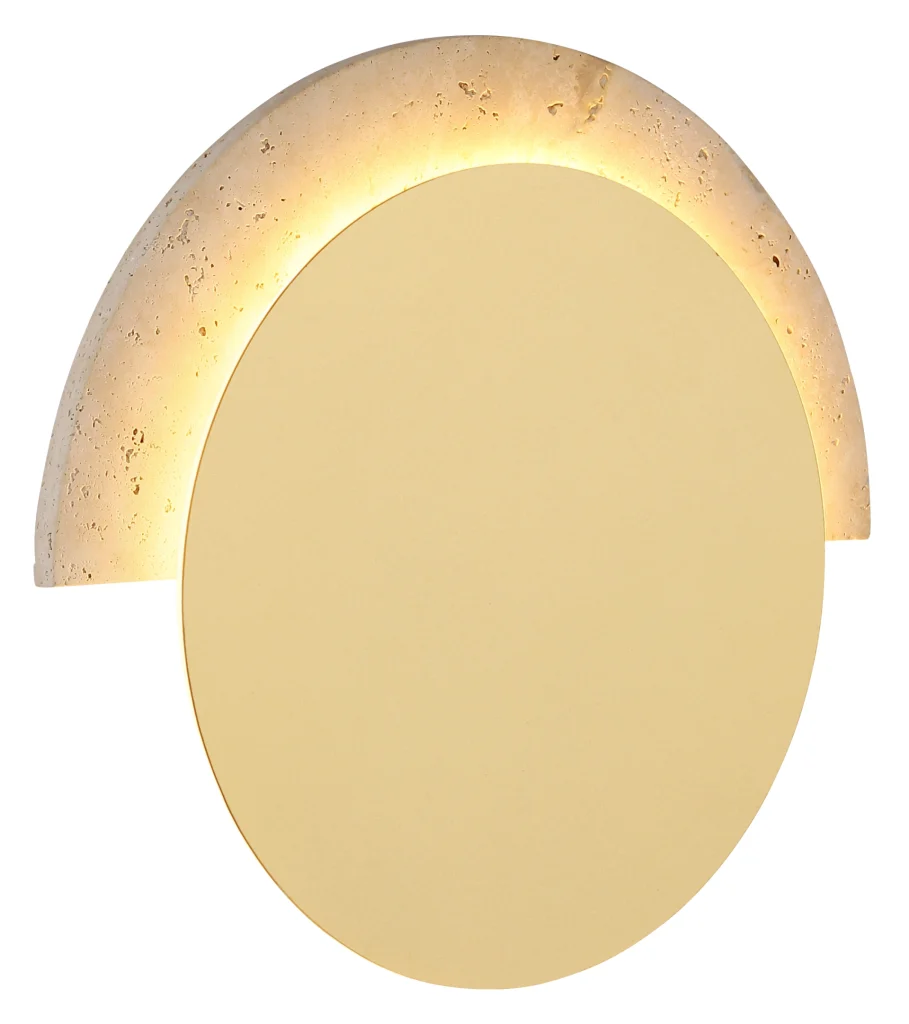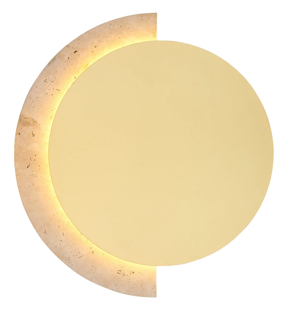 Okrugla zidna lampa ROJAS u vintage stilu impresionira svojim elegantnim dizajnom ravnog diska i toplim, prirodnim izgledom. Mat belo metalno kućište sa prefinjenim mat zlatnim akcentima daje svetlu visokokvalitetan, bezvremenski izgled. Abažur napravljen od pravog travertina obezbeđuje meku, bezodsjajnu raspodelu svetlosti i ističe prirodni karakter svetiljke. Integrisana LED tehnologija pruža svetlosni fluks od 753 lumena sa prijatnom toplo belom temperaturom boje od 3000 K, stvarajući ugodnu atmosferu. Sa širinom od 205 mm i tankom projekcijom od samo 32 mm, ROJAS se diskretno uklapa u širok spektar koncepata enterijera. Bilo da je u dnevnoj sobi, hodniku ili spavaćoj sobi, ova zidna lampa dodaje stilske akcente i kombinuje prirodne materijale sa modernim udobnošću osvetljenja.