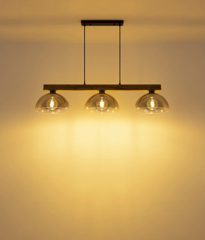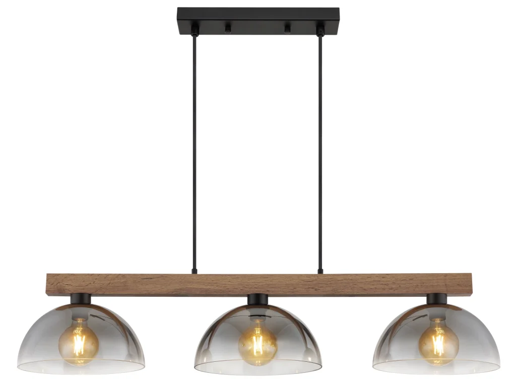 Viseća lampa ROMY kombinuje modernu eleganciju sa prirodnim šarmom, čineći je stilskim akcentom u svakom životnom prostoru. Prava, izdužena drvena greda u tamnosmeđoj boji formira osnovu lampe i nosi tri harmonično raspoređena staklena abažura. Ovi abažuri su napravljeni od dimljenog, providnog, blago gradijentnog stakla koje stvara dekorativnu atmosferu osvetljenja i čini svetiljku veoma svestranom. Mat crno metalno kućište dodaje moderan akcenat i daje ROMY-ju bezvremenski izgled koji se dobro uklapa sa mnogim stilovima enterijera. Sa dužinom od 1140 mm i širinom od 300 mm, viseća lampa je idealna za trpezarijske stolove, kuhinjska ostrva ili otvorene dnevne prostore. Dizajnirana za E27 sijalice, omogućava individualni izbor lumena – savršeno za svakoga ko ceni maksimalnu fleksibilnost u dizajnu osvetljenja. Napravite stilski izraz iznad svog stola sa visećom lampom ROMY!