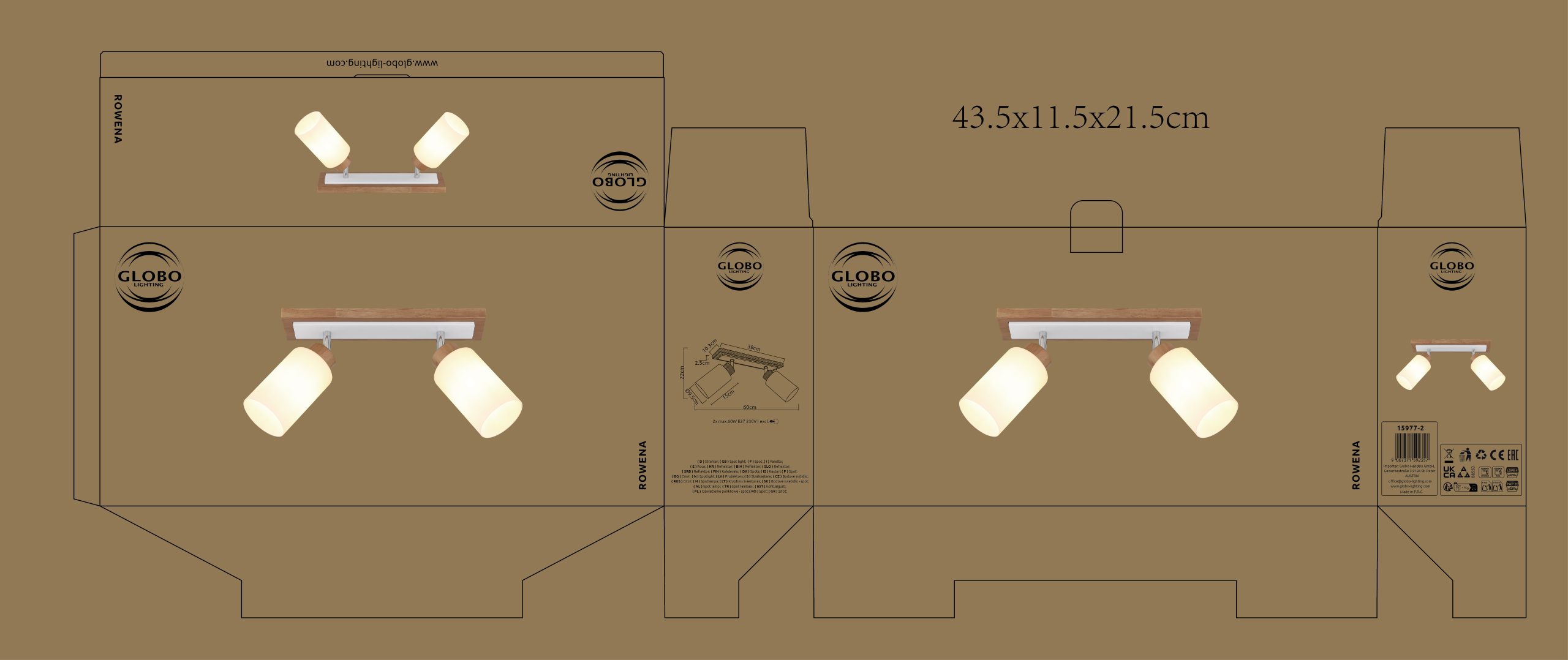 Reflektor ROWENA kombinuje prirodne materijale sa modernim dizajnom i postaje stilski akcenat na svakom zidu ili plafonu. Pravougaona zidna ploča napravljena od pravog smeđeg drveta formira toplu i autentičnu osnovu i harmonično je dopunjena mat belim i hromiranim metalnim elementima. Ova visokokvalitetna kombinacija materijala daje svetlu bezvremensku eleganciju koja se bez napora uklapa i u klasične i u moderne enterijere. Dva cilindrična abažura napravljena od mat opal stakla pružaju ravnomernu raspodelu svetlosti bez odsjaja i stvaraju ciljane akcente osvetljenja u prostoriji. Sa dužinom od 600 mm i širinom od 103 mm, ROWENA je idealna za hodnike, dnevne boravke, spavaće sobe ili kao stilsko akcentno osvetljenje iznad ogledala, slika ili nameštaja. Zahvaljujući dva E27 grla, možete slobodno birati izvore svetlosti i individualno podešavati osvetljenost i temperaturu boje. Bilo da je u pitanju funkcionalno opšte osvetljenje ili dekorativno akcentno svetlo, ROWENA impresionira fleksibilnošću, visokokvalitetnom izradom i harmoničnom kombinacijom drveta, stakla i metala.