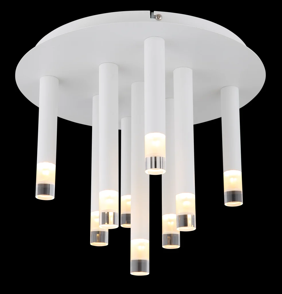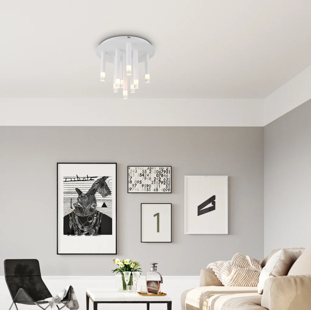 Plafonska lampa RYAN impresionira svojim modernim i istovremeno elegantnim dizajnom. Sa devet tankih, cilindričnih abažura napravljenih od mat belog metala i satenskog providnog akrila, donosi harmoničnu raspodelu svetlosti u svaku prostoriju. Ova okrugla rasvetna tela su savršena za prostorije kojima je potrebno ravnomerno, ali stilsko osvetljenje. Mat belo metalno kućište daje lampi bezvremensku estetiku, dok satenski završeni akril dodaje moderan dodir. Plafonska lampa RYAN je idealna za dnevne i trpezarijske prostore, gde impresionira svojom visokokvalitetnom izradom i efikasnom emisijom svetlosti. Kombinuje funkcionalnost sa atraktivnim dizajnom i besprekorno se uklapa u različite stilove nameštaja, od modernog do klasičnog. RYAN je savršen izbor za one koji cene stilska rešenja za osvetljenje.