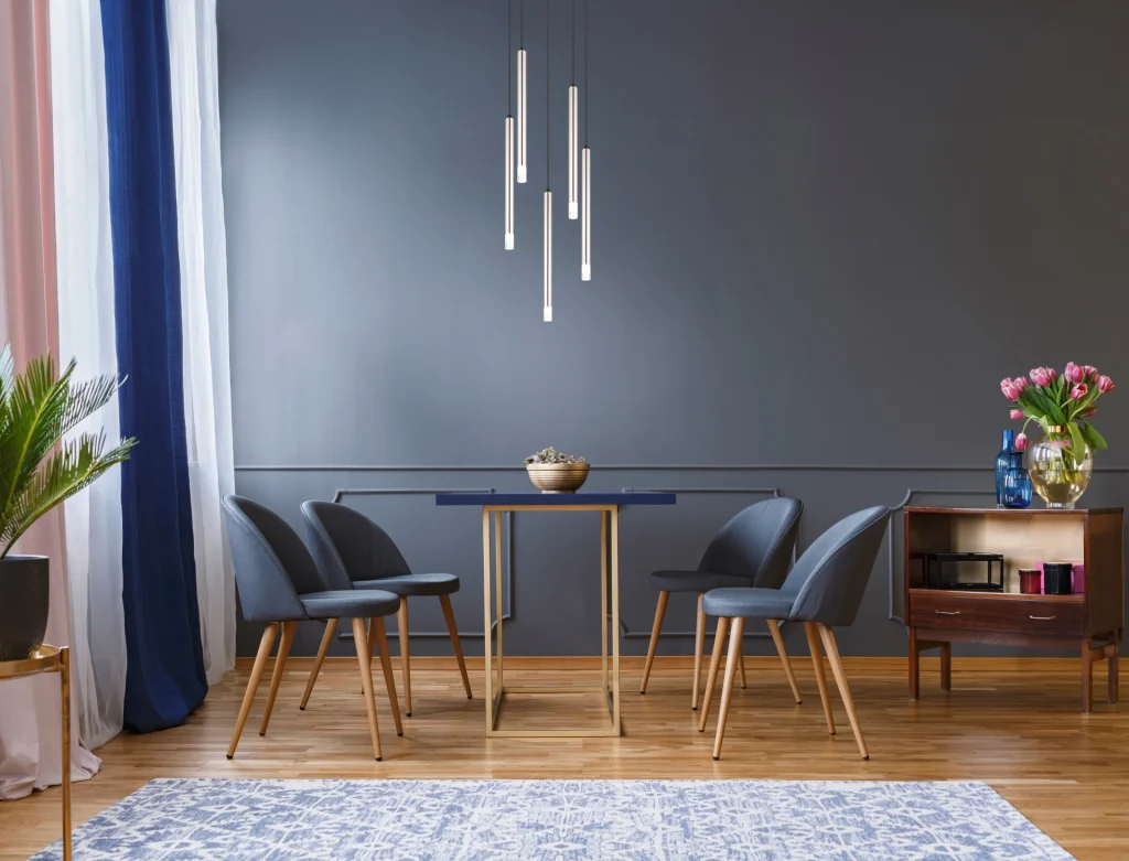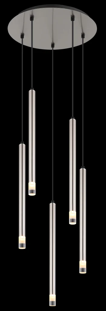 Viseća lampa RYAN impresionira svojim modernim i elegantnim dizajnom. Sa okruglim telom napravljenim od mat nikla, harmonično se uklapa u različite dnevne sobe. Lampa je opremljena sa pet tankih, cilindričnih abažura, koji su takođe napravljeni od mat nikla i akrila sa satenskom završnom obradom. Ova kombinacija obezbeđuje ravnomernu i prijatnu raspodelu svetlosti. Abažuri su okačeni u okruglom rasporedu, što svetiljci daje poseban vizuelni efekat. RYAN je idealna za upotrebu u trpezarijama, dnevnim sobama ili iznad klupskih stočića. Jasan i jednostavan dizajn čini ovu viseću lampu bezvremenskim elementom koji se lako može integrisati u različite stilove opremanja. Sa svojom visokokvalitetnom izradom i elegantnim izgledom, viseća lampa RYAN nudi funkcionalno i estetsko rešenje za osvetljenje koje stvara prijatnu atmosferu i osvetljava svaku prostoriju sa stilom.