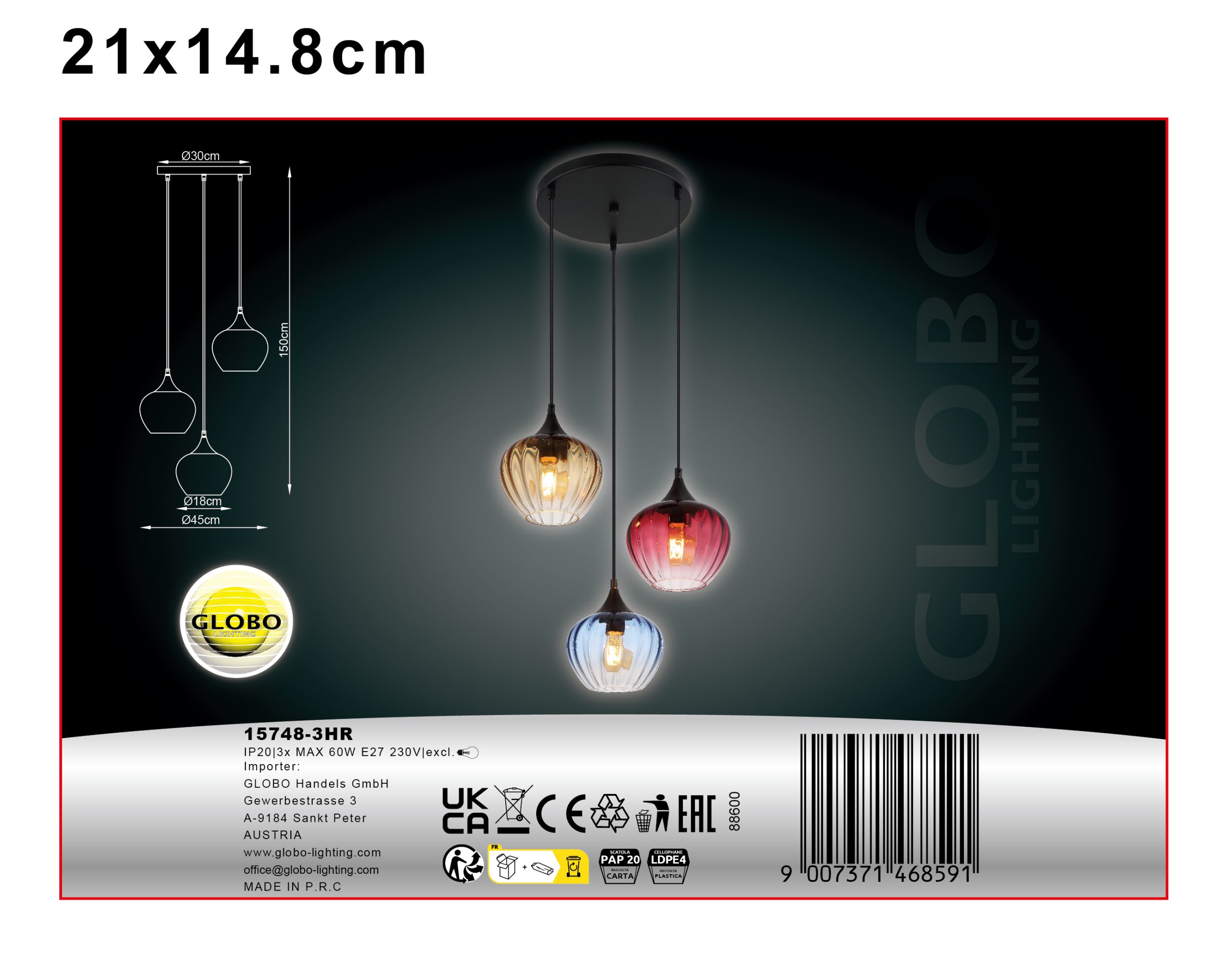 Viseća lampa SANDER napravljena od crnog mat metala impresionira svojim jedinstvenim dizajnom. Stakla u plavoj, crvenoj i ćilibarnoj boji koja se protežu po providnom platnu pružaju fascinantnu igru svetlosti i stvaraju posebnu atmosferu u prostoriji. Sočiva su takođe opremljena žlebovima koji efikasno prelamaju svetlost i stvaraju harmoničan ambijent. Crni PVC kabl upotpunjuje dizajn viseće lampe SANDER i daje joj moderan izgled. Ova lampa je pravi magičan za oko i savršena je za dnevne sobe, trpezarije ili čak restorane i barove. Sa SANDER-om možete uneti komad bezvremenske elegancije i atmosferske svetlosti u svoj dom.