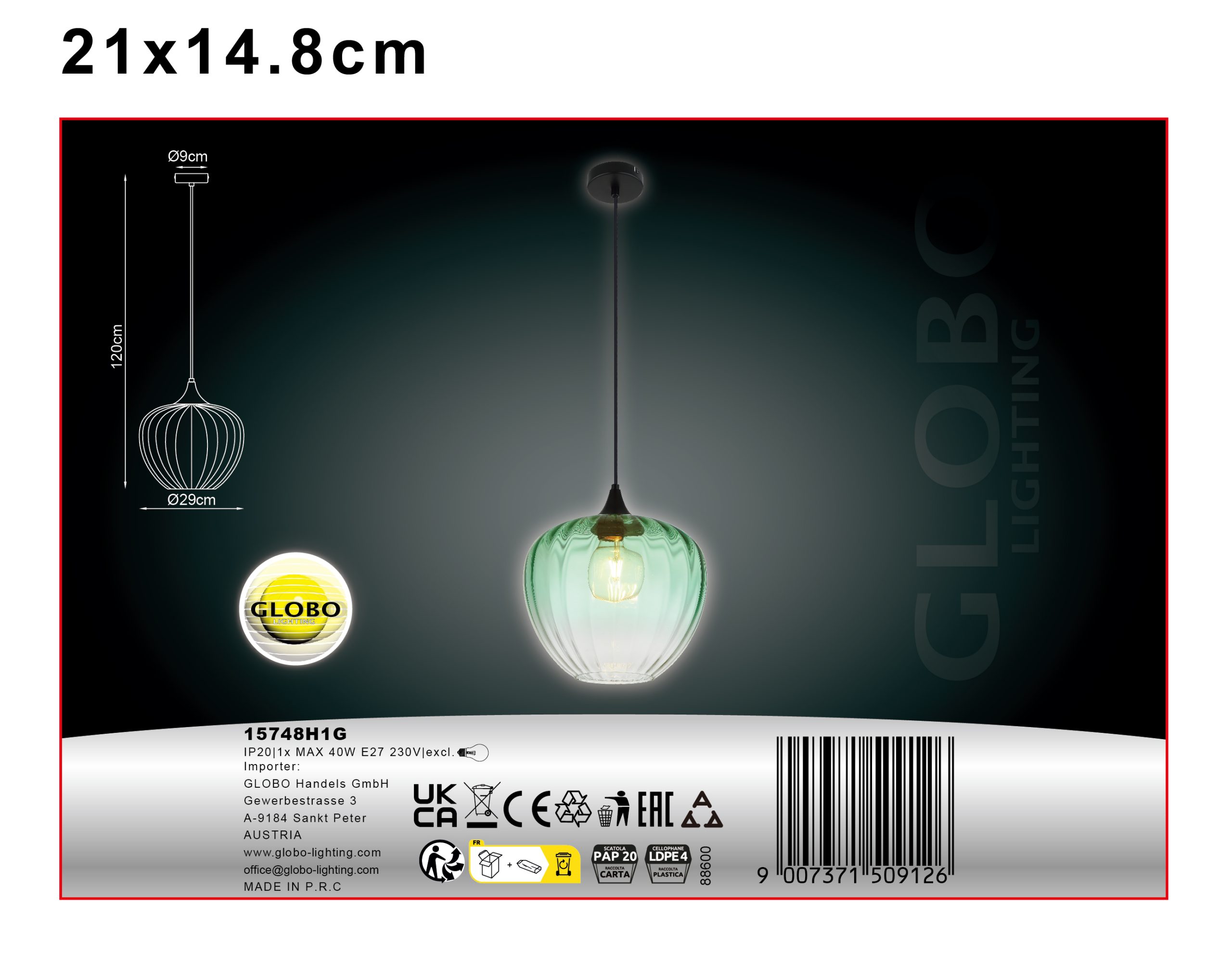 Viseća lampa SANDER nudi impresivnu kombinaciju dizajna i funkcionalnosti. Okrugli, lukovičasti abažur napravljen od zelenog stakla sa žlebovima i gradijentom pruža meko i toplo osvetljenje. Mat crno metalno kućište upotpunjuje elegantan dizajn. Idealna za trpezarije ili dnevne sobe, grlo E27 omogućava fleksibilan izbor izvora svetlosti.