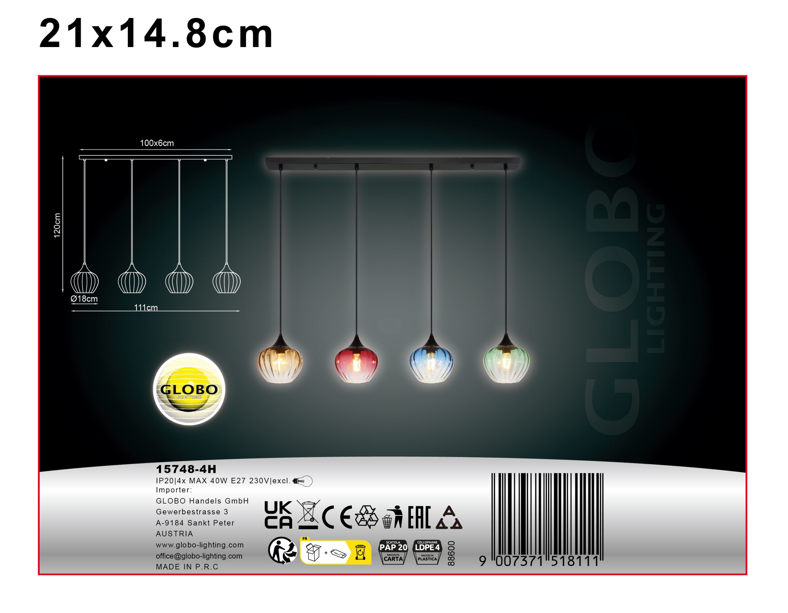 Viseća lampa SANDER nudi živopisno rešenje za osvetljenje sa četiri šarena, lukovicasta sočiva u zelenoj, plavoj, crvenoj i ćilibarnoj boji. Sočiva, koja imaju jasan gradijent boja, pružaju moderan i stilski izgled. Mat crno metalno kućište dopunjuje boje i predstavlja elegantan dodatak velikim trpezarijama ili dnevnim sobama. Grlo E27 omogućava fleksibilan izbor izvora svetlosti.