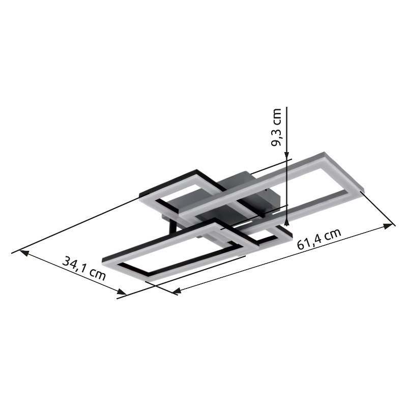 Plafonska lampa SAPENA ima pravougaoni dizajn koji se sastoji od tri pravougaonika jedan na drugom. Telo je napravljeno od mešavine mat crne plastike i mat sive plastike, što pruža jedinstven izgled. Abažur je napravljen od opal plastike i nudi difuzno osvetljenje. Lampa ima izlaznu snagu od 1200 lumena i temperaturu boje od 3000 K (toplo bela), što pruža prijatno i meko osvetljenje. Idealna za osvetljavanje javnih prostora, kancelarija ili životnih prostora, plafonska lampa SAPENA nudi moderan i bezvremenski izgled. Zahvaljujući svom fleksibilnom dizajnu, može se koristiti u različitim prostorijama za stvaranje ujednačenog osvetljenja.