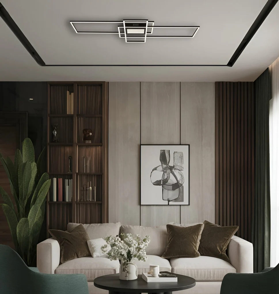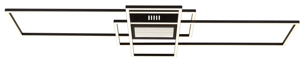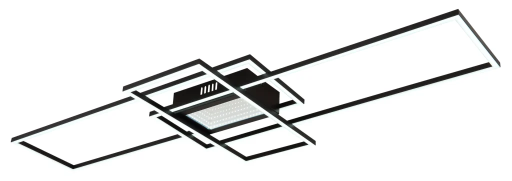 Plafonska lampa SAUNDERS pravougaonog dizajna sa tri preklopljena i stepenasto raspoređena pravougaonika nudi impresivno rešenje za osvetljenje. Crno metalno kućište i abažur od aluminijuma u crnoj, mat i plastičnoj opalnoj boji stvaraju privlačan 3D efekat. Sa svetlosnim izlazom od 3302 lumena i CCT-om od 2700K do 6500K, možete fleksibilno podesiti temperaturu svetlosti. Daljinski upravljač, funkcija dimiranja, funkcija memorije i noćno svetlo sa tri nivoa pružaju sveobuhvatnu kontrolu i podešavanje osvetljenja.