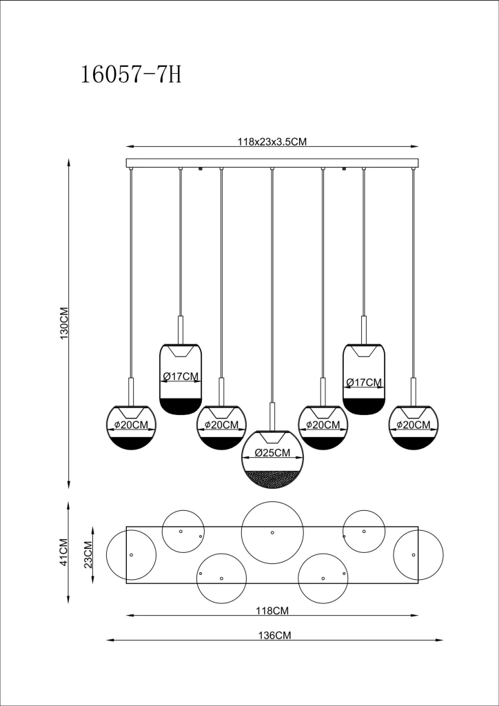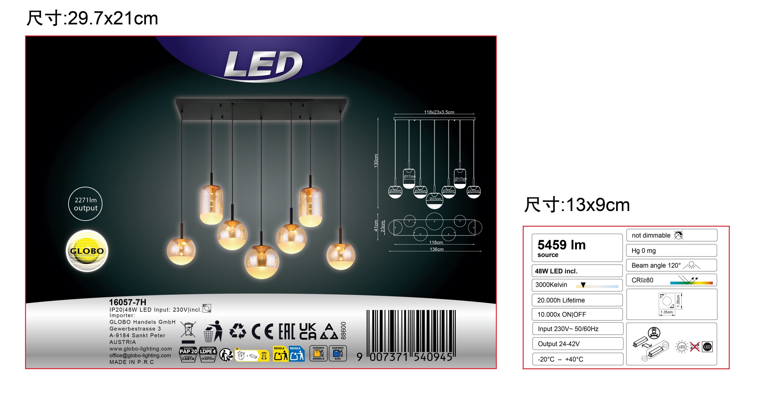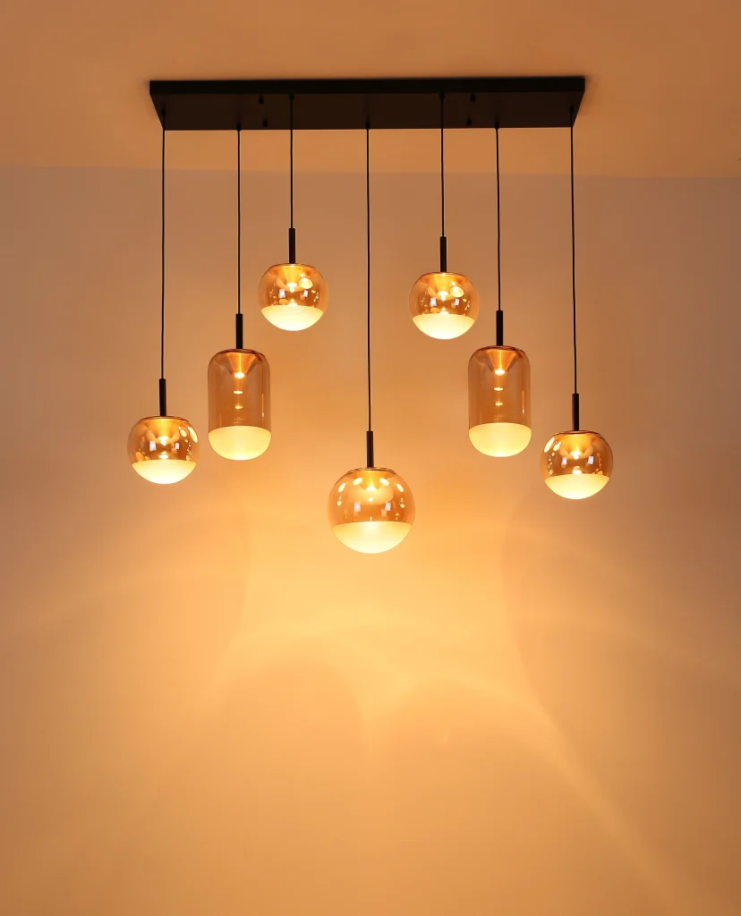 Viseća lampa SEVERIN impresionira svojim kreativnim dizajnom i sedam različitih stakala koja stvaraju posebnu atmosferu osvetljenja. Pravougaono telo napravljeno od mat crnog metala stvara moderan kontrast sa abažurima napravljenim od aluminijuma boje mesinga i sočivima boje ćilibara sa satenskom završnom obradom. Ova kombinacija obezbeđuje ravnomerno i toplo osvetljenje koje se savršeno uklapa u različite koncepte prostorija. Sa dužinom od 1360 mm i širinom od 410 mm, viseća lampa je idealna za velike trpezarijske stolove ili kao atmosfersko akcentno osvetljenje u dnevnim sobama. Integrisana LED tehnologija pruža snaga lumena od 2250 lumena na temperaturi boje od 3000K (toplo bela). Ova viseća lampa kombinuje plemenite materijale i inovativni dizajn kako bi stvorila funkcionalno osvetljenje i prijatnu atmosferu. Savršen je ukras za moderne sobe koji zrači elegancijom i stilom.