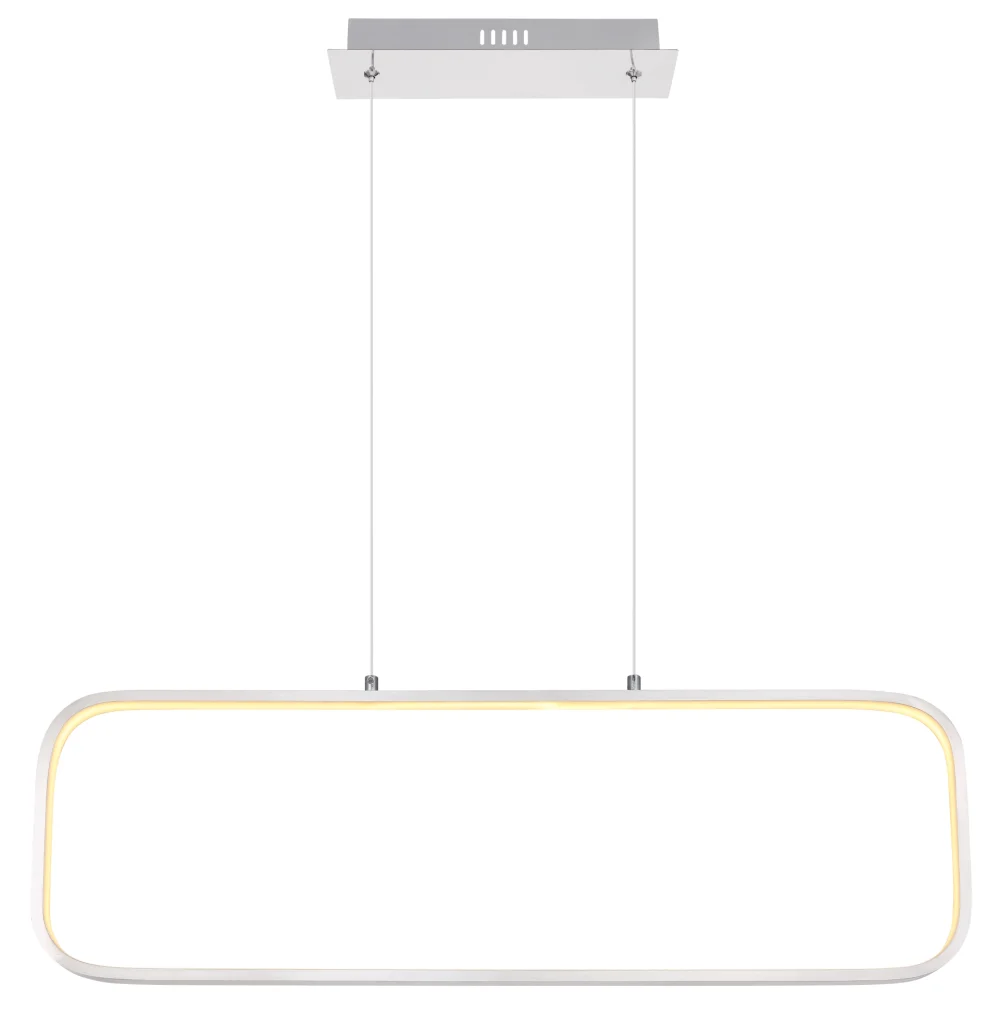Ova izuzetno moderna viseća lampa (80×10 cm) iz serije Silla impresionira svojim prelepim dizajnom. Od pravougaonog plafonskog nosača u srebrnoj boji, dva bela kabla maksimalne visine 1,2 m vode do oblikovanog zaobljenog pravougaonog belog okvira sa integrisanom LED sijalicom koja prijatno sija toplo belo svetlo od 3000 Kelvina i time vašim sobama pruža odličnu atmosferu.