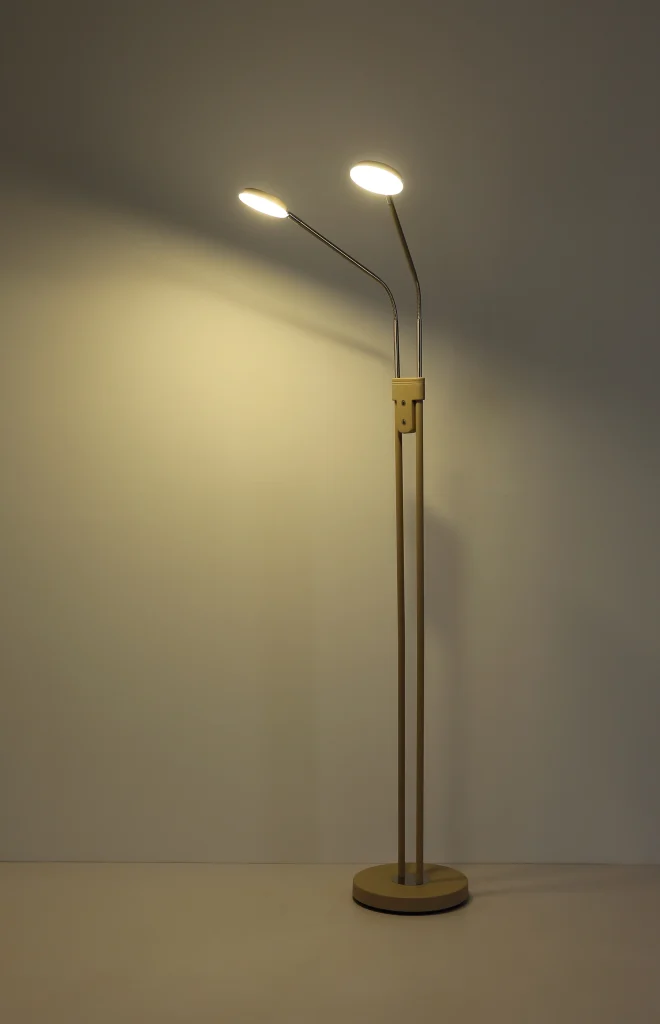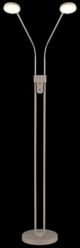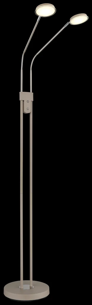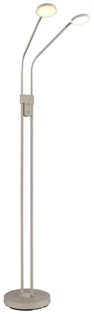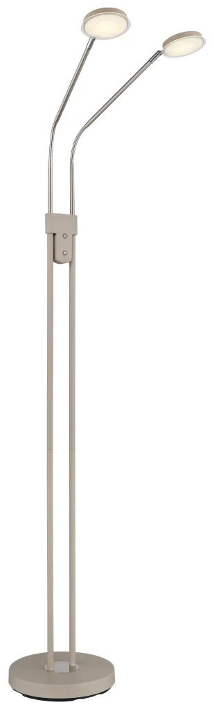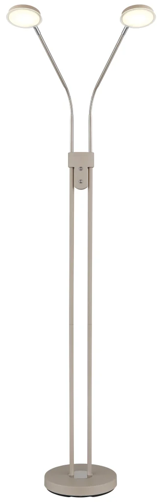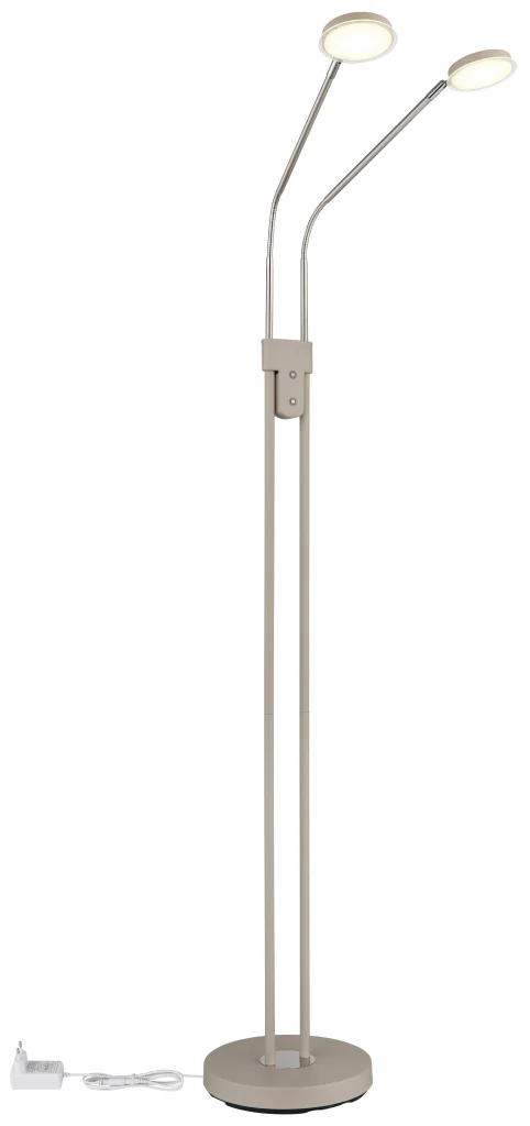Podna lampa SILVIO impresionira modernim dizajnom i maksimalnom fleksibilnošću i predstavlja savršeno rešenje za osvetljenje životnih i radnih prostora. Tanki stub podržava dva fleksibilna kraka koja omogućavaju individualno podešavanje oba izvora svetlosti, idealno za ciljano osvetljenje tokom čitanja, rada ili opuštanja. Dva ravna abažura sa dekorativnim akrilnim detaljima pružaju ravnomerno osvetljenje bez odsjaja i dodaju stilske akcente prostoriji. Telo napravljeno od mat metala boje peska, upotpunjeno niklovano-mat i hromiranim detaljima, daje lampi visokokvalitetan i bezvremenski izgled koji se harmonično uklapa u širok spektar stilova enterijera. Zahvaljujući dva integrisana prekidača na dodir, oba reflektora se mogu kontrolisati odvojeno i praktično se koriste putem dodirnog uključivanja/isključivanja. Kontinuirani dimer na dodir omogućava precizno podešavanje osvetljenosti, dok se temperatura boje može fleksibilno podesiti od toplih 2700 K do neutralnih 4000 K i fiksirati po želji. Sa svetlosnim izlazom od 350 lumena, kompaktnim dimenzijama od 550 x 250 mm, integrisanim adapterom i modernom LED tehnologijom, podna lampa SILVIO nudi efikasno, svestrano osvetljenje u elegantnom dizajnu.