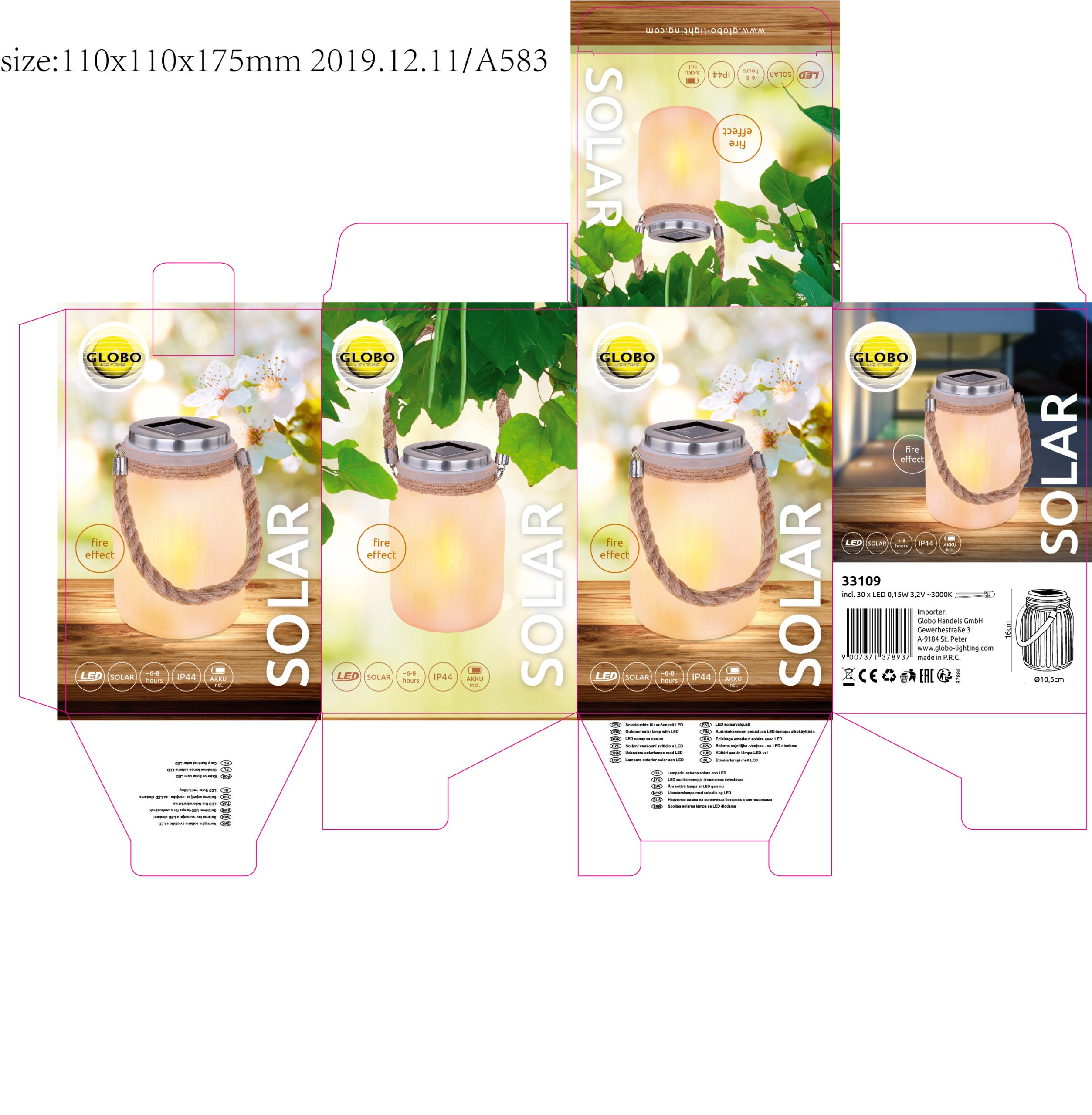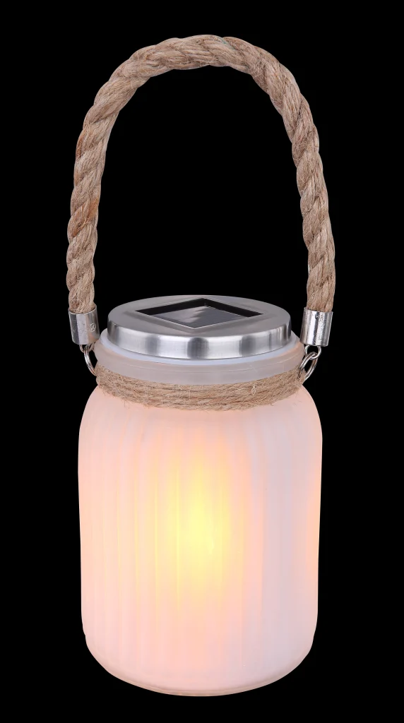 Ova dekorativna lampa, koja se može postaviti na sto, ali i na veliki nosač u žbunju, drveću ili čak na podupirače suncobrana, izgleda kao fenjer i opremljena je treperećim LED diodama. Zahvaljujući klasi zaštite IP44, ova svetiljka visine 16 cm je idealna za upotrebu na otvorenom.