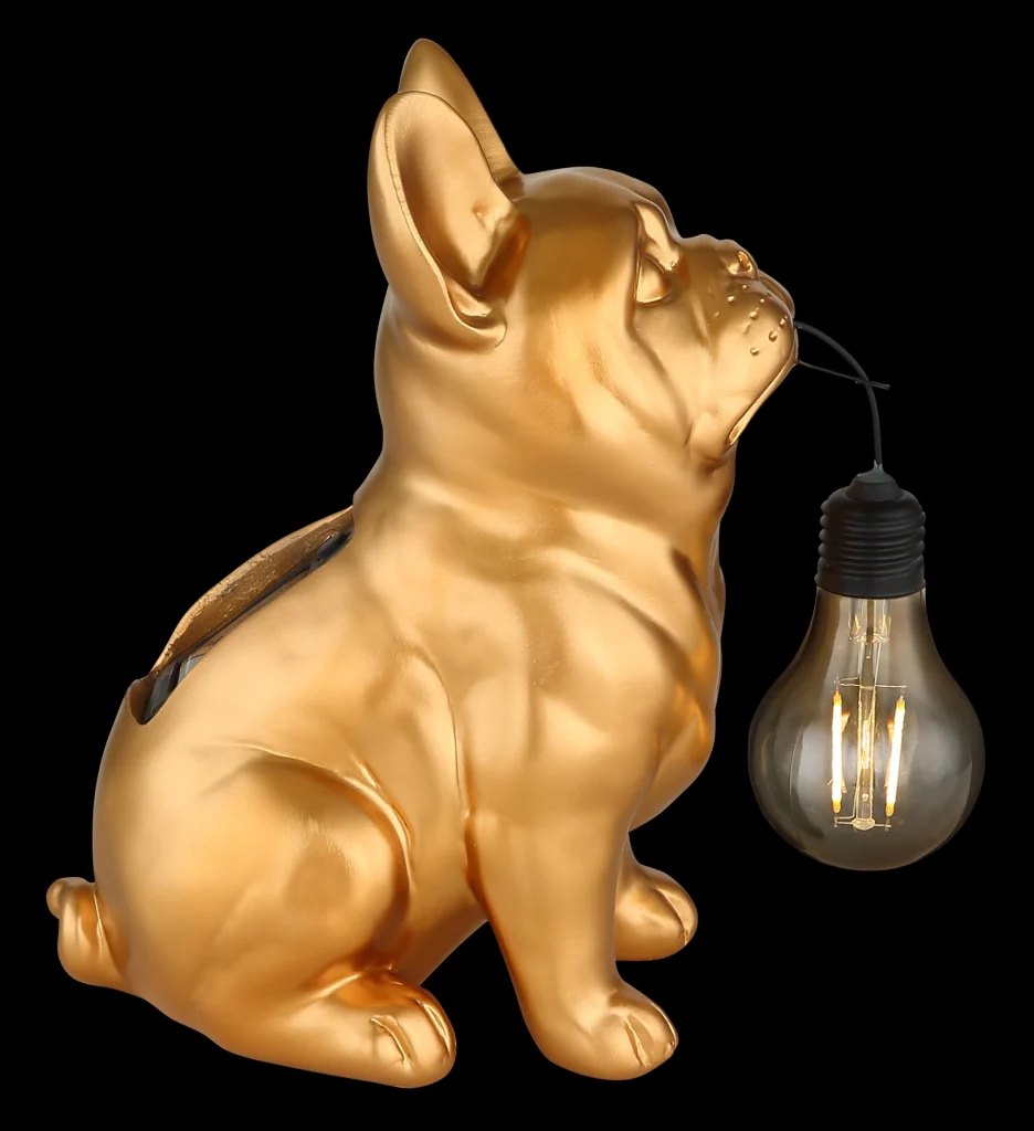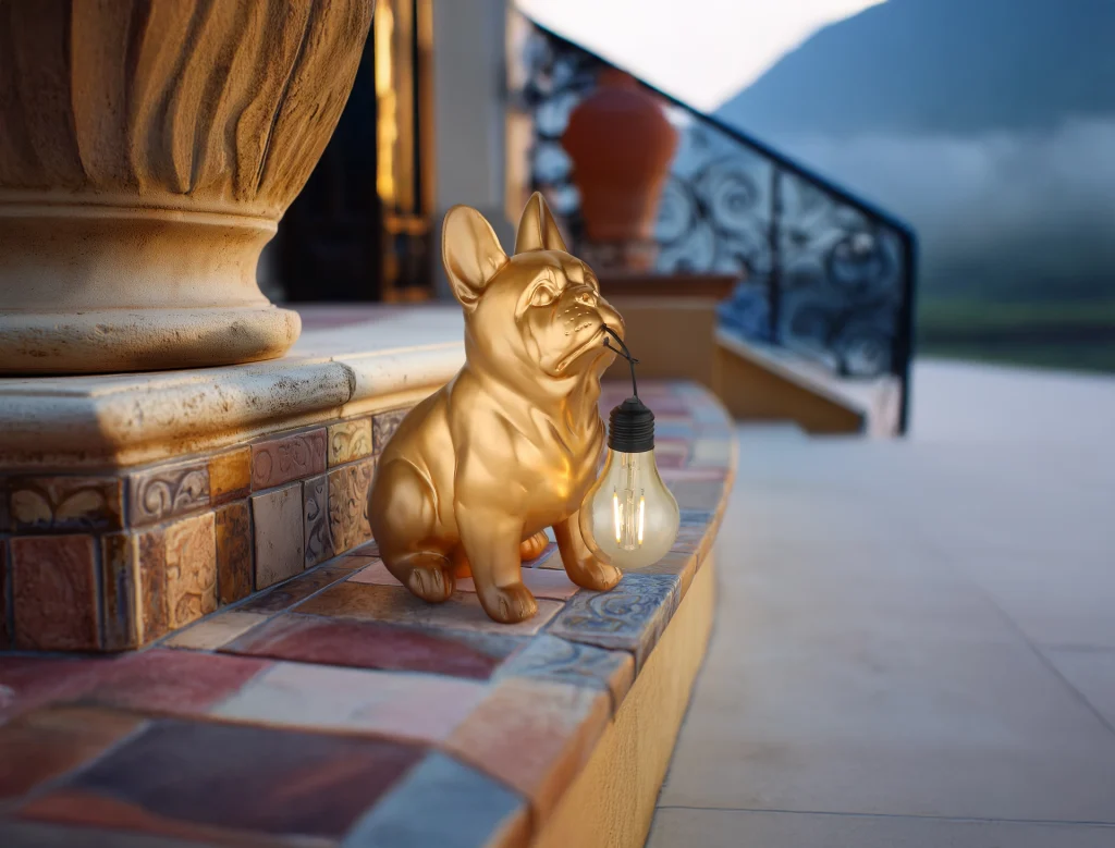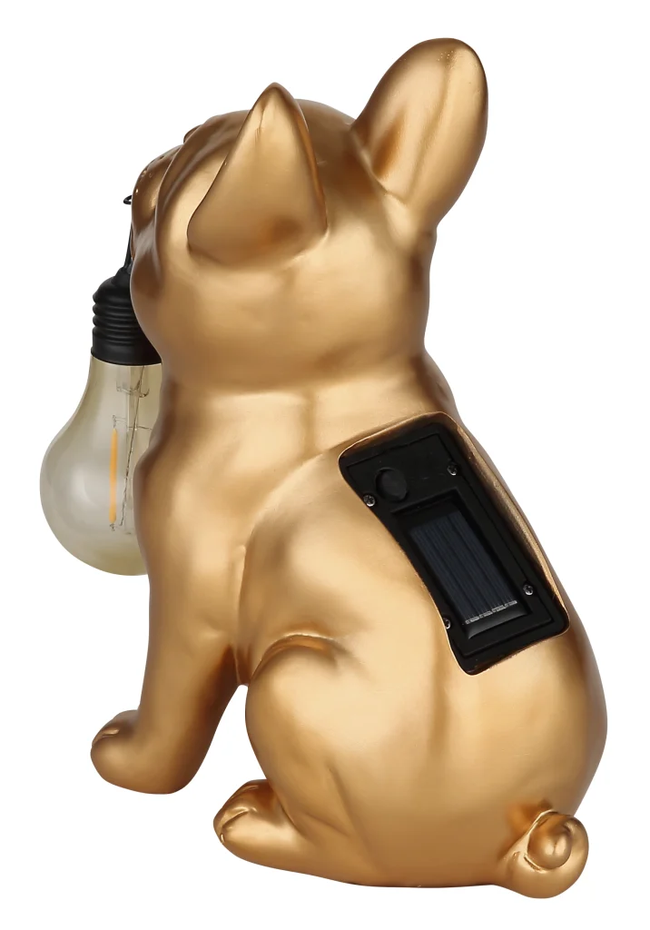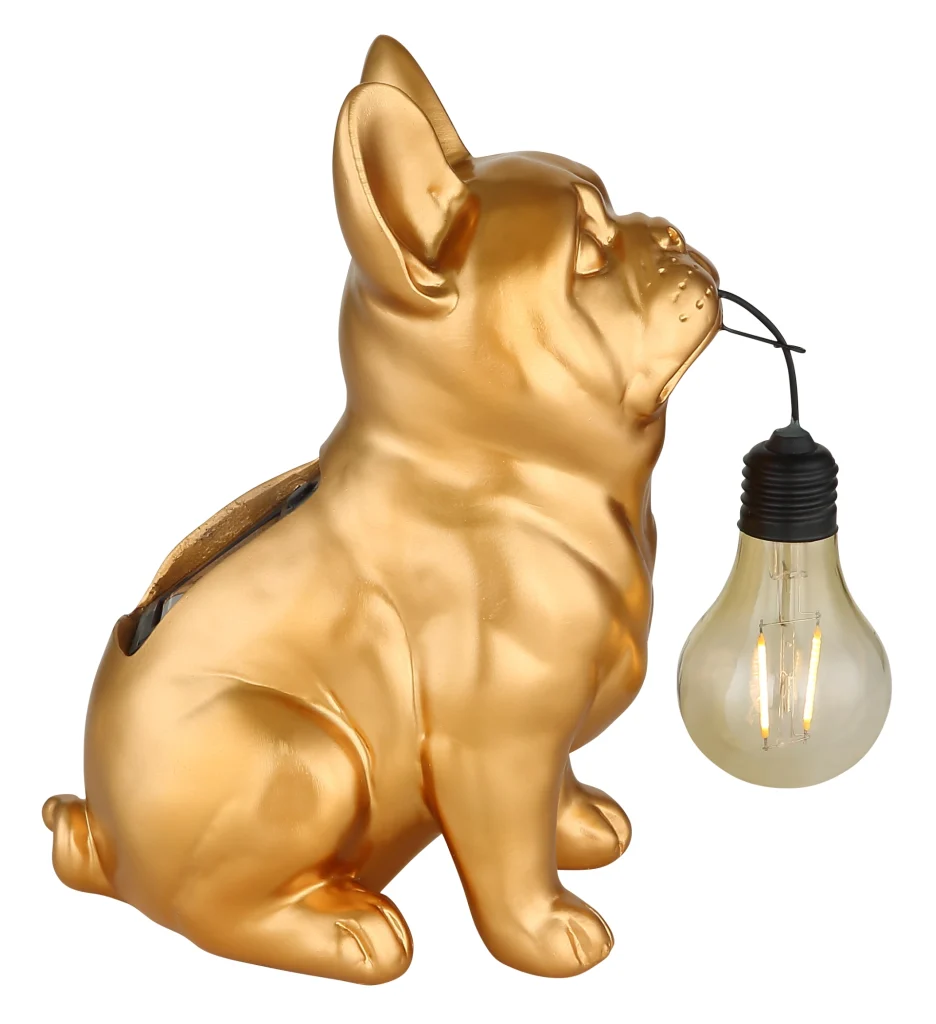 Ova dekorativna solarna lampa u obliku buldoga je stilski ukras za bašte, terase ili balkone. Moderni dizajn elegantno ističe integrisana LED dioda sa filantnom strujom, koja emituje toplu i prijatnu svetlost na 3000 Kelvina. Telo je napravljeno od mat zlatne plastike u kombinaciji sa izdržljivom mat crnom plastikom, što lampi daje visokokvalitetan i moderan izgled. Abažur od plastike ćilibarne boje pojačava efekat toplog osvetljenja i stvara prijatnu atmosferu na otvorenom. Kao praktičan solarni proizvod, lampa se automatski puni tokom dana preko integrisanog solarnog panela i uključuje se u sumrak. Rukovanje je jednostavno zahvaljujući dugmetu. Sa dimenzijama D: 240 mm i Š: 120 mm, solarna lampa se može fleksibilno postaviti. Sa IP44 zaštitom, otporna je na prskanje vode i idealna je za upotrebu na otvorenom. Uključujući LED diodu, savršeno kombinuje dekorativni izgled sa funkcionalnim osvetljenjem.