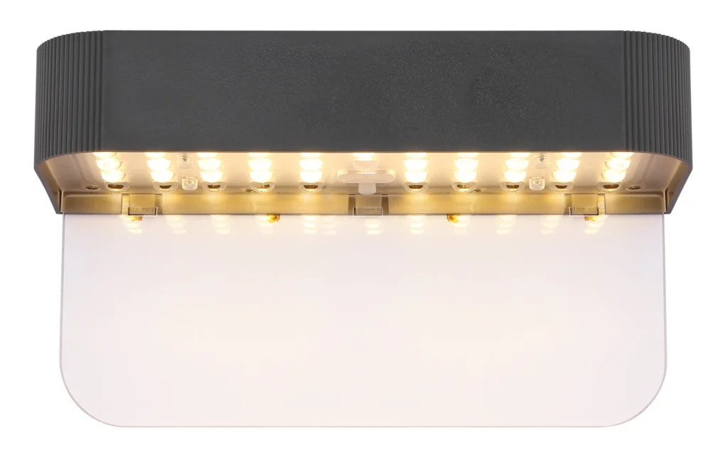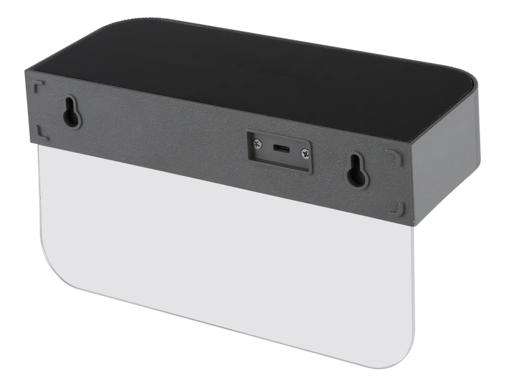 Ravna solarna zidna lampa sa kućnim brojem kombinuje moderan dizajn sa visokom funkcionalnošću. Telo od mat sive plastike i providni akrilni abažur obezbeđuju elegantan, savremen izgled. Opremljena snažnom LED diodom, lampa postiže do 1000 lumena sa prijatnom toplo belom bojom svetlosti od 3000 K. Zahvaljujući integrisanom detektoru pokreta, možete birati između tri režima osvetljenja: 1) stalno stanje pripravnosti sa 100 lm, 2) stanje pripravnosti 100 lm – sa pokretom 500 lm tokom 25 sekundi, ili 3) bez stanja pripravnosti – sa pokretom 1000 lm tokom 25 sekundi. Stepenski prekidač na prekidaču pritiska omogućava lako podešavanje. Punjenje se vrši ili putem sunčeve svetlosti (približno 8 sati) ili putem USB-C (približno 5 sati), a osvetljenje traje do 12 sati. Obim isporuke uključuje nalepnice za kućne brojeve (1x AE i 3x 0-9). Sa klasom zaštite IP65, lampa je otporna na vremenske uslove i savršena za spoljnu upotrebu.