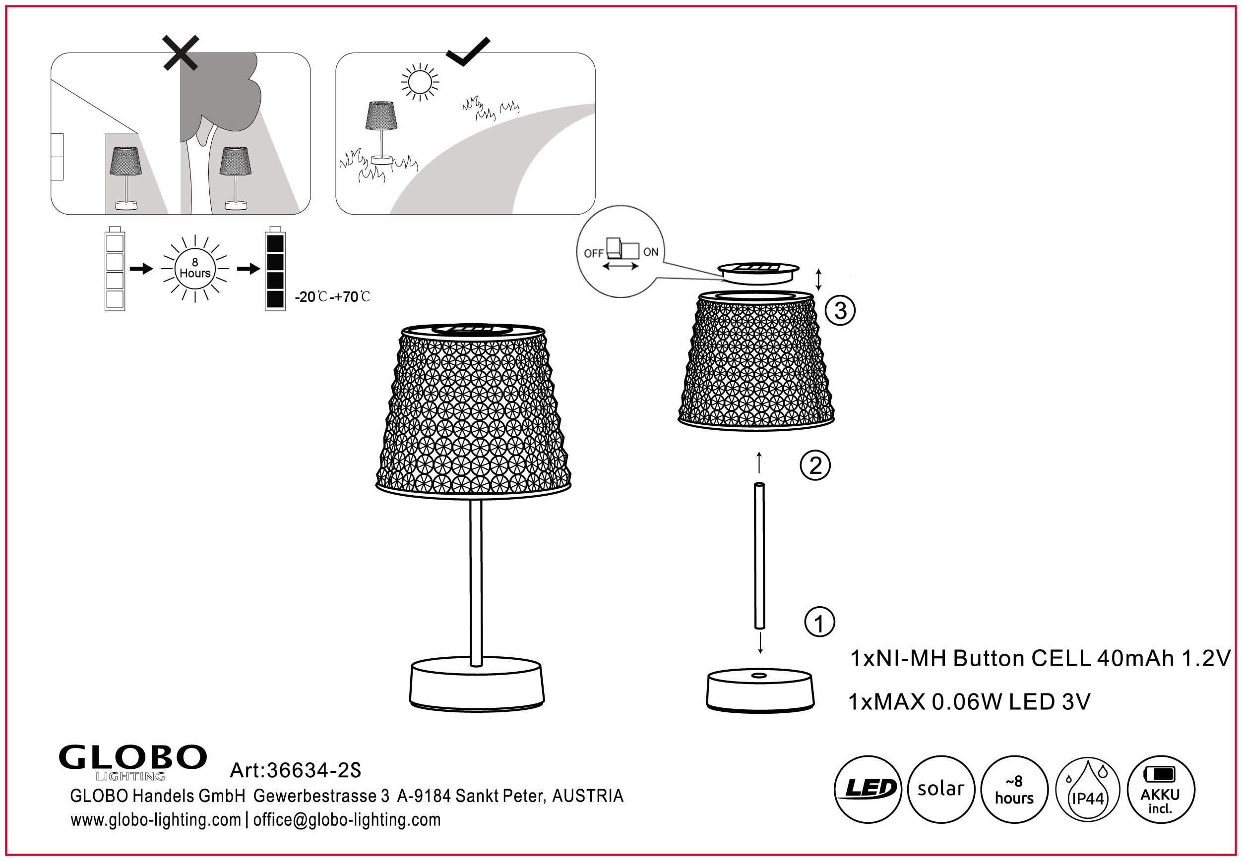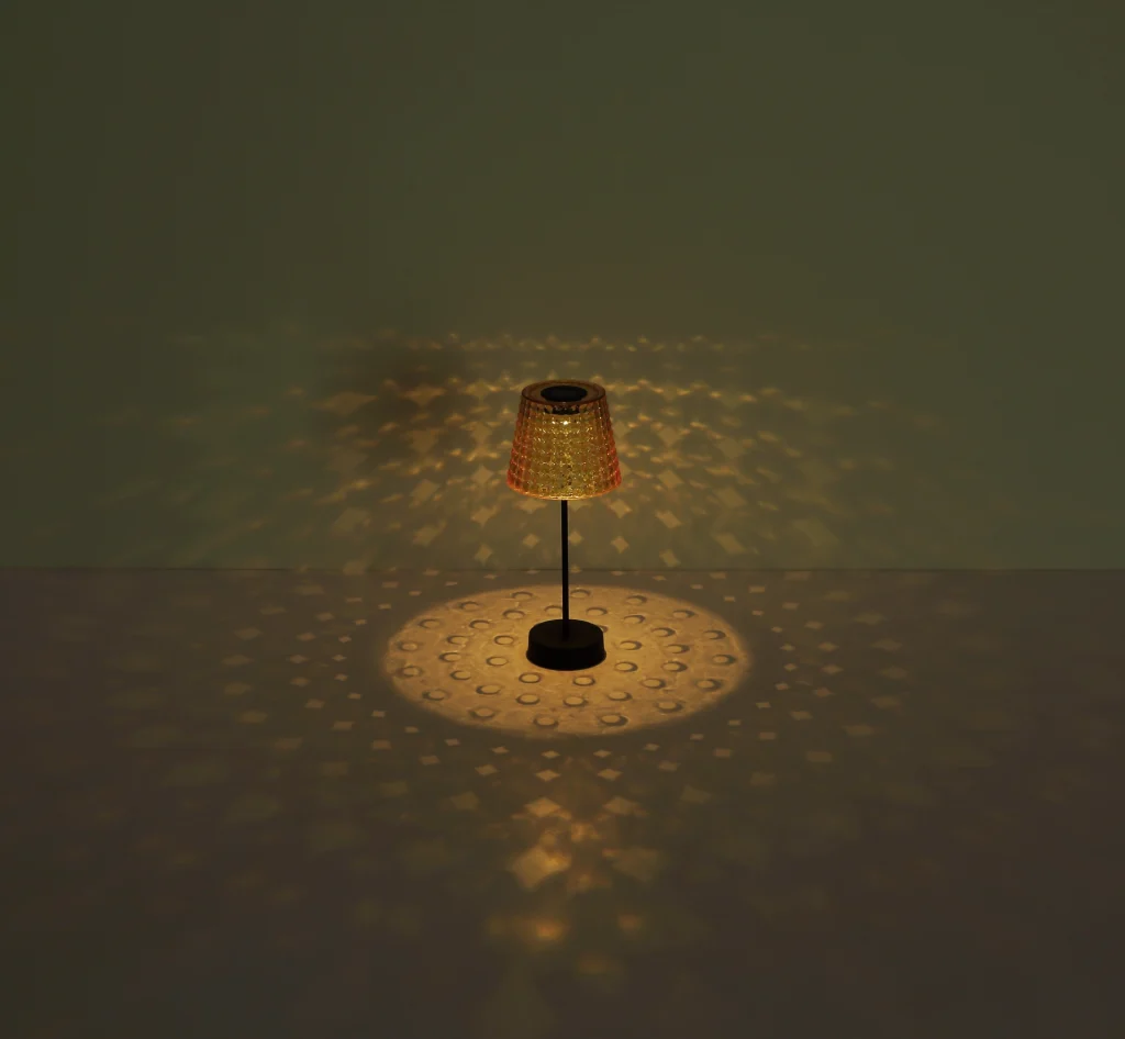 Zapanjujuća solarna lampa koja će vašem prostoru dodati toplu atmosferu. Lampa je napravljena od crne mat plastike i fascinantne plastike boje dima koja nežno filtrira svetlost. Kristalni abažur je jedinstven i daje lampi poseban dodir. Sa prečnikom od 125 mm i visinom od 290 mm, ova solarna lampa je prava atrakcija u svakoj prostoriji. Klizni prekidač je jednostavan za upotrebu. Ova svetiljka se isporučuje sa 1x LED diodom od 0,06 W 3 V. Baterija (40 mAh 1,2 V) je takođe uključena. Ovaj set sadrži 2 dela solarne lampe. Nadamo se da ćete sa ovom solarnom lampom podići svoje sobe na novi nivo!
