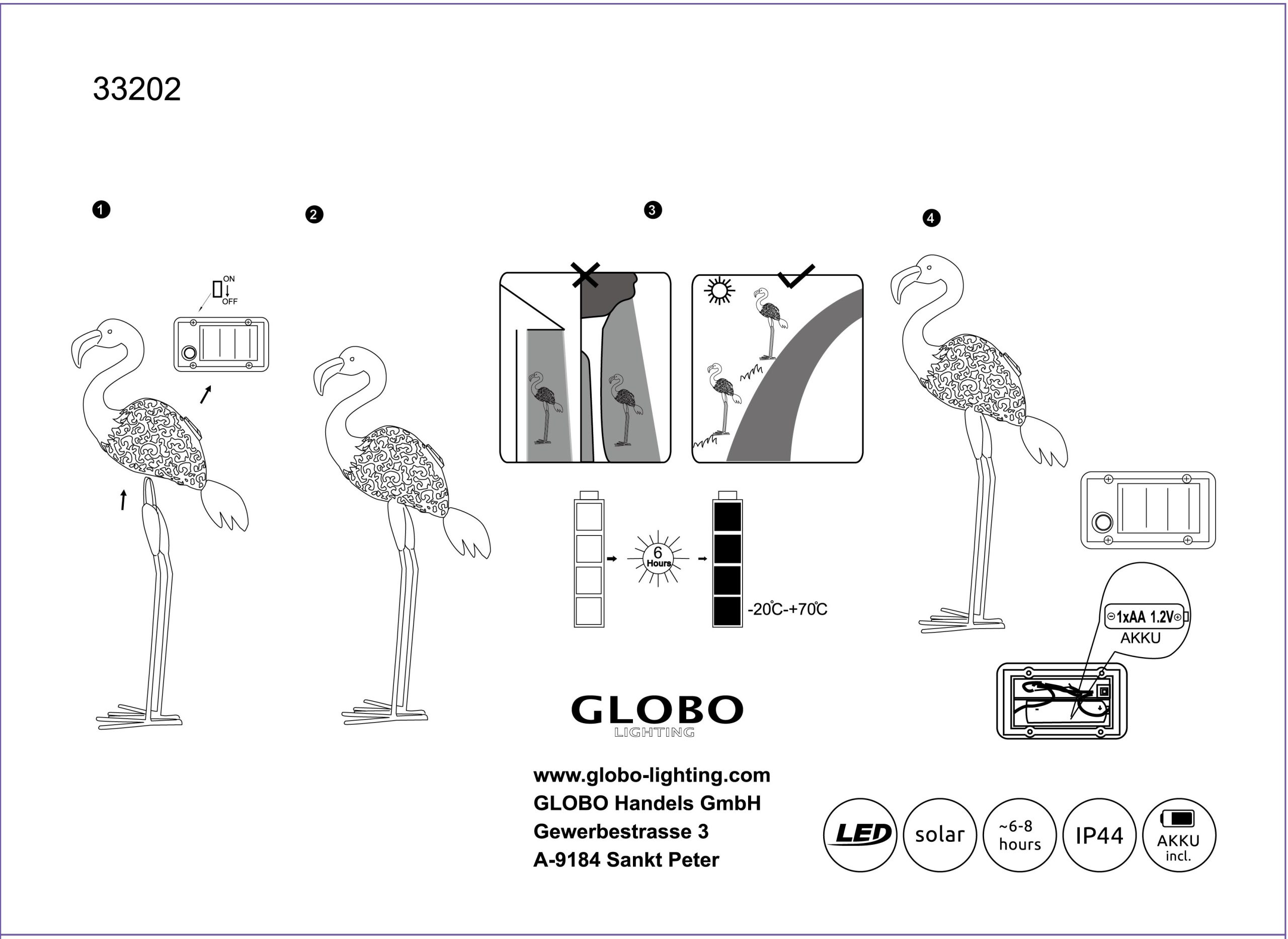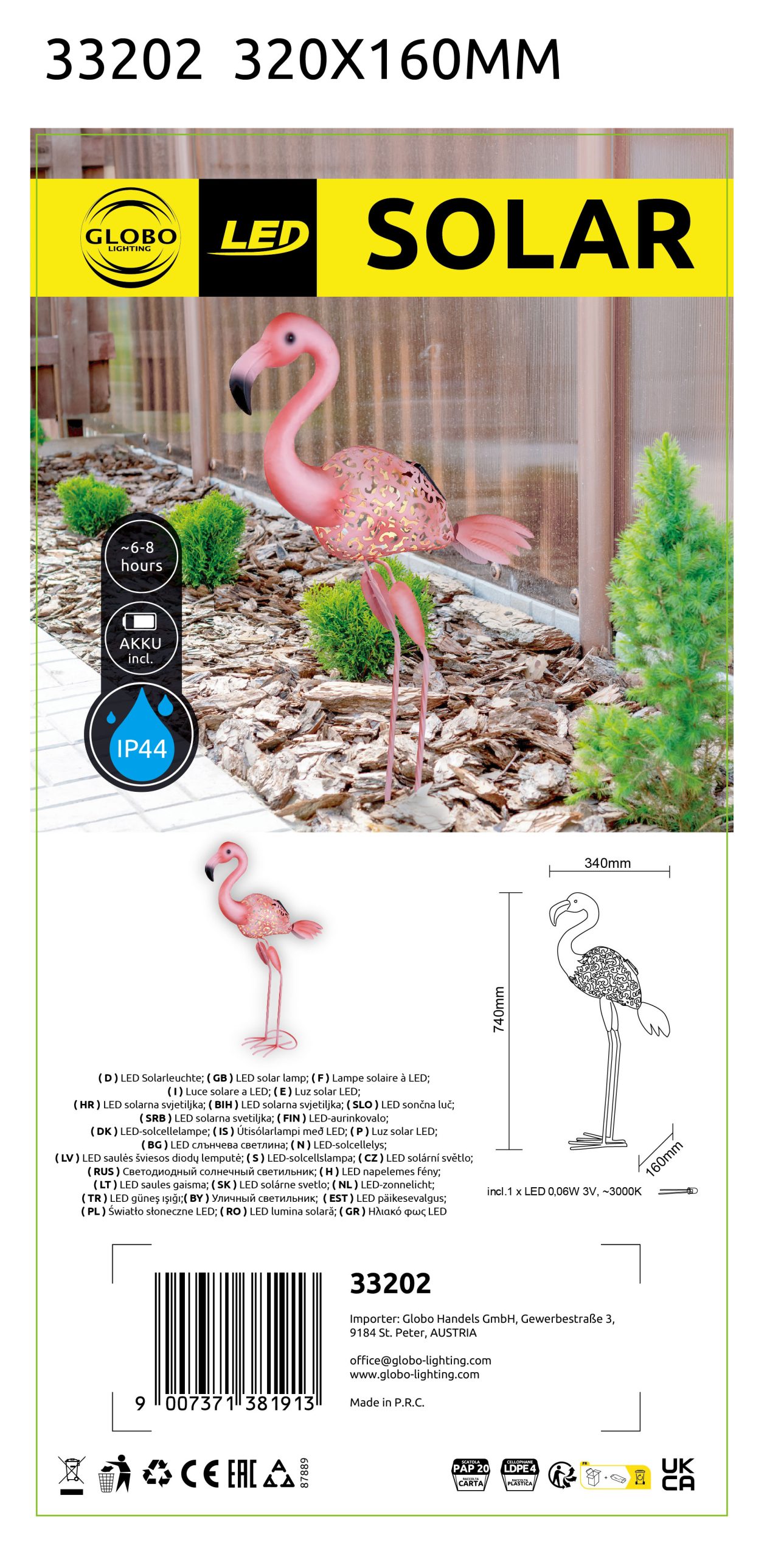 Ova ružičasta solarna lampa napravljena od metala oduševljava umove svojim flamingo oblikom. Solarno telo sija LED svetlošću od 0,06 W sa prijatnom, toplom belom bojom od 3000K. Sa stepenom zaštite IP44, ova solarna lampa je idealna za upotrebu na otvorenom.