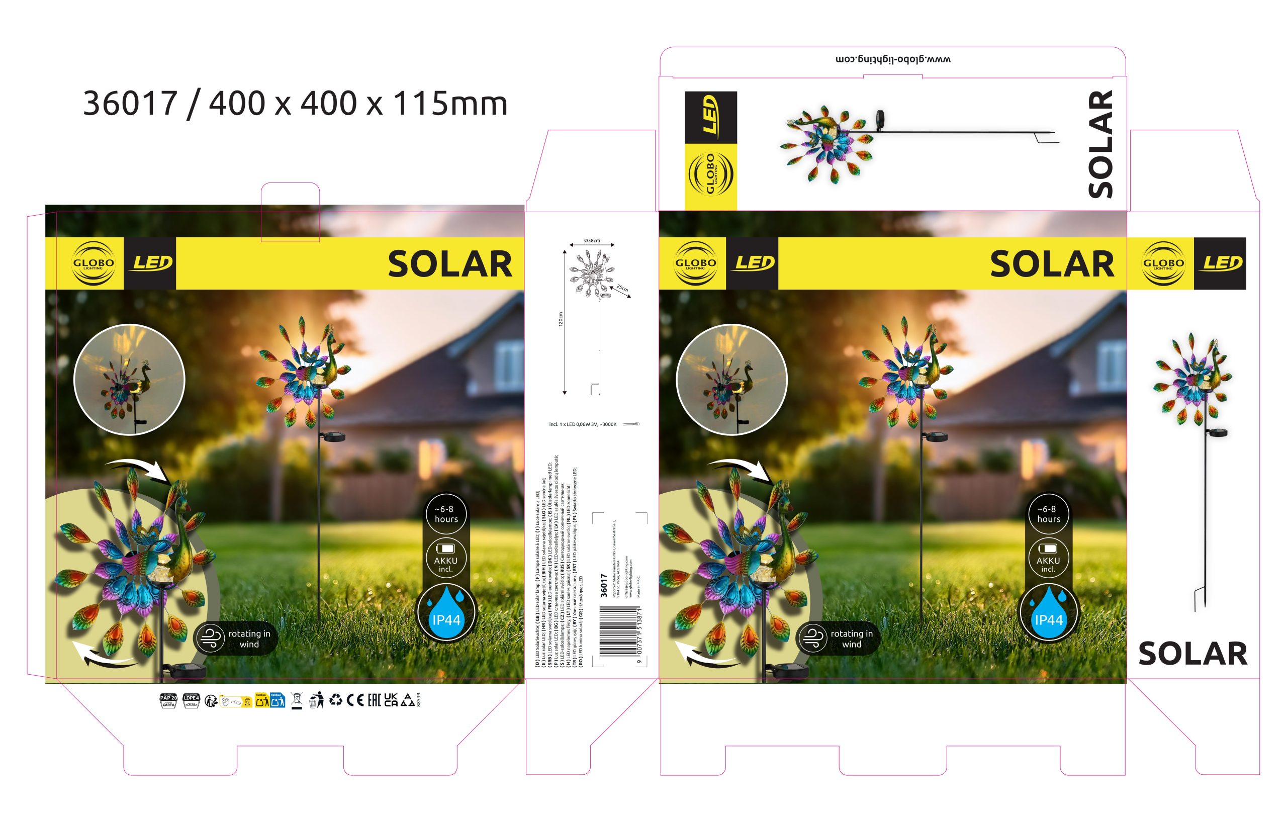 SOLARNA LAMPA METAL CRNA MAT unosi boju u vašu baštu svojim impresivnim dizajnom pauna. Ova jedinstvena solarna lampa sastoji se od crnog, mat metalnog kućišta i šarenih metalnih akcenata na abažuru koji umetnički ističu pauna. Šiljak za zemlju obezbeđuje lako i bezbedno postavljanje u zemlju, tako da se lampa može fleksibilno koristiti u bašti. Sa integrisanom LED diodom i toplom temperaturom boje od 3000 K, stvara atmosfersko osvetljenje. Klizni prekidač omogućava praktično uključivanje i isključivanje, dok solarna energija napaja svetiljku kontinuiranom snagom. Zahvaljujući robusnom materijalu i klasi zaštite IP44, svetiljka je otporna na vremenske uslove i idealna za spoljašnju upotrebu. SOLARNA LAMPA METAL MAT nije samo privlačna za pogled, već i praktično i ekološki prihvatljivo rešenje za osvetljenje vaše bašte ili balkona.