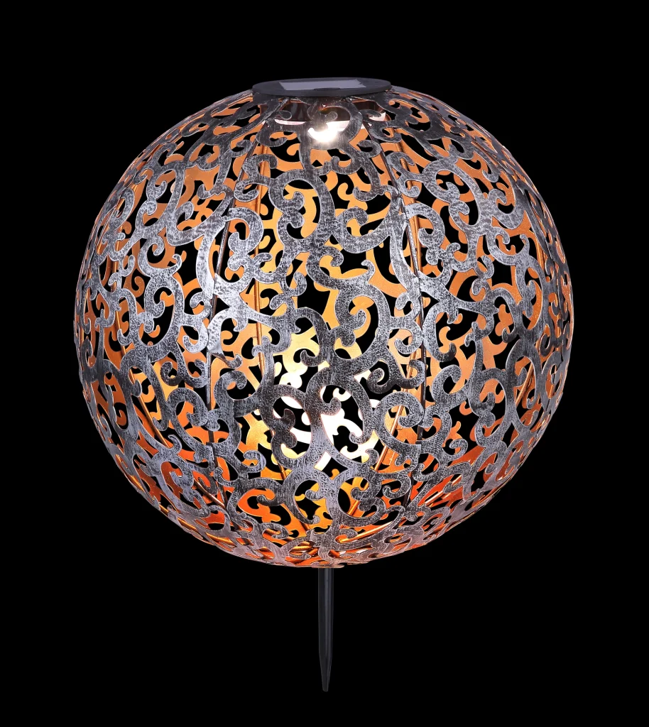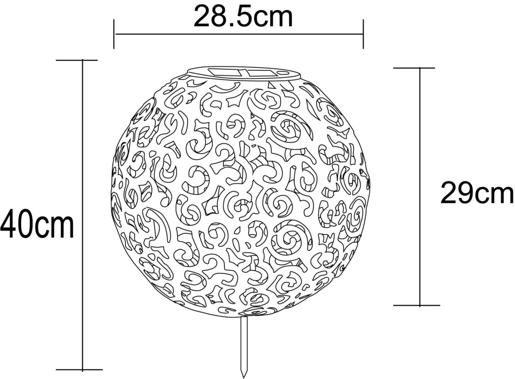 Ova srebrna metalna solarna lampa visine 40 cm obogaćuje vašu baštu svojim antičkim dizajnom. Prelepa kugla (Ø 28,5 cm) sa bušenim uzorkom čini da svetlost izgleda posebno efektno. Lampa sija sa prijatno toplih 3000 Kelvina zahvaljujući integrisanoj bateriji do 8 sati. Zahvaljujući IP44 zaštiti, ova solarna svetiljka je idealna za upotrebu na otvorenom.