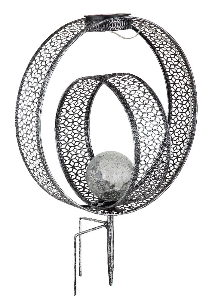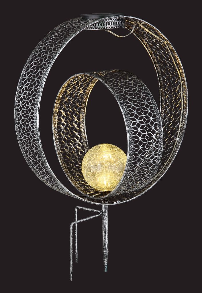 Ova prelepa solarna lampa za spoljašnju upotrebu u srebrnoj boji inspiriše svojim prelepim dizajnom. Ova lampa od 42 cm sastoji se od dva isprepletena metalna prstena sa prelepim uzorcima i prelepe LED sijalice u sredini, koja emituje prijatnu toplu belu svetlost od 2700 Kelvina.