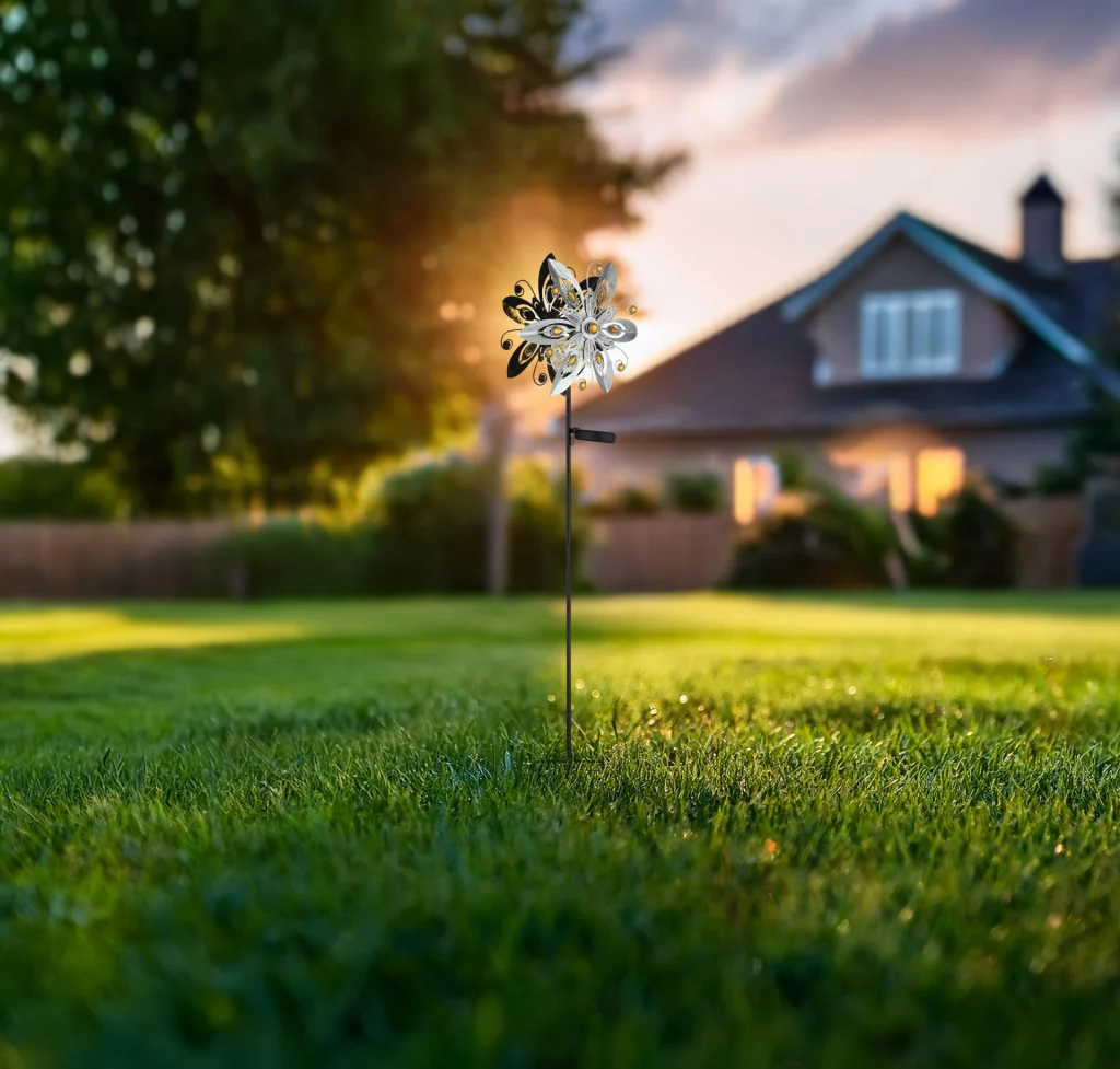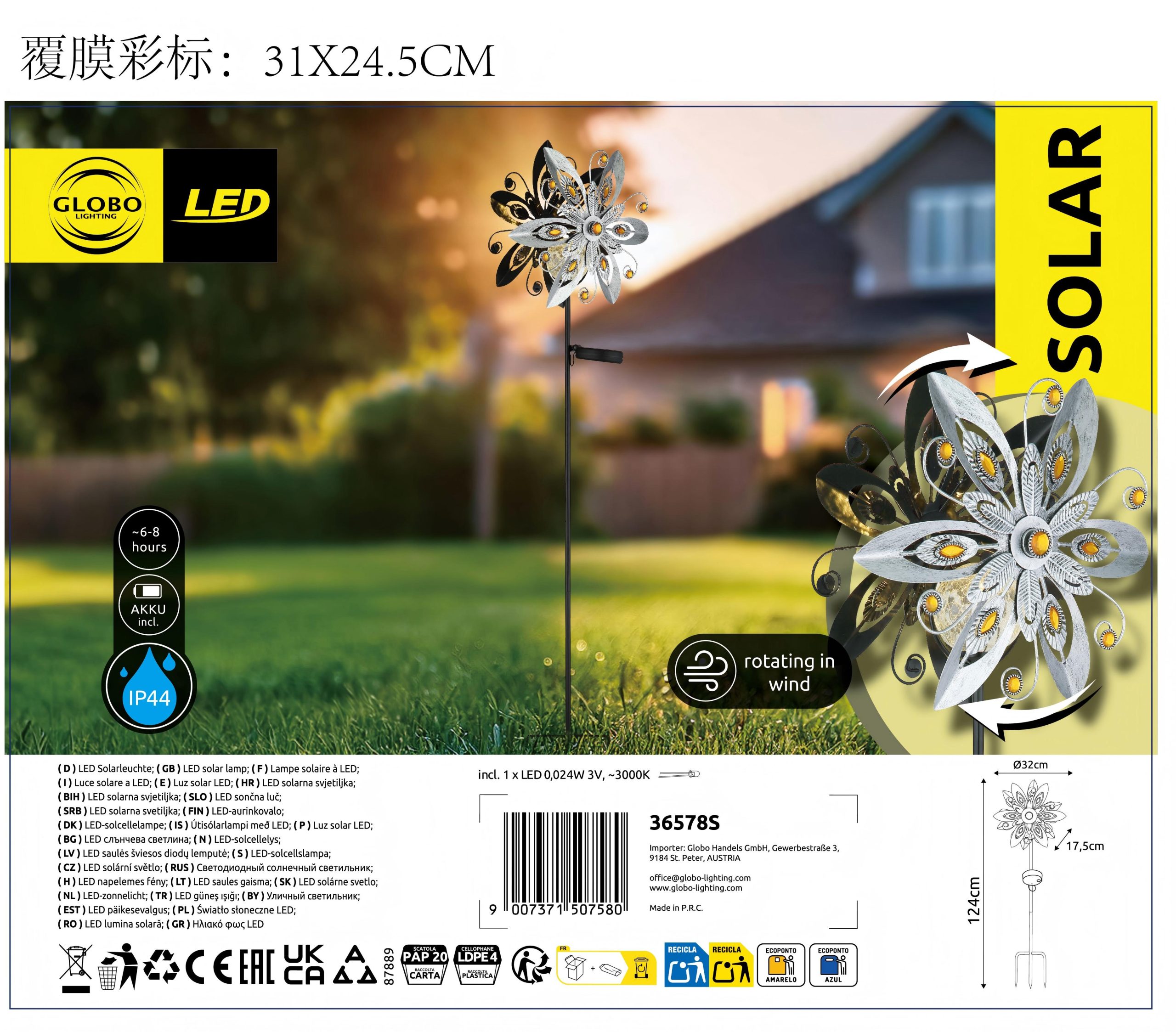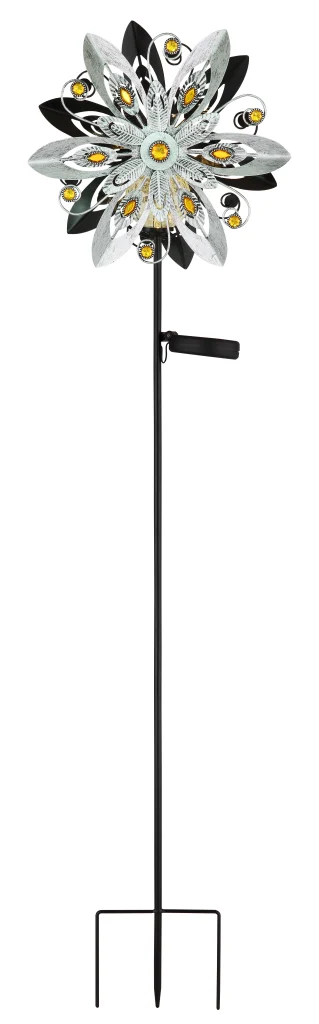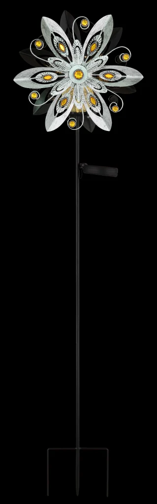SOLARNA LAMPA METAL SILVER GREY u dizajnu vetroturbine donosi moderno i elegantno rešenje za osvetljenje u vašu baštu. Srebrno-sivo metalno kućište i providni stakleni abažur sa žutim staklenim kristalima stvaraju stilsku atmosferu. Opremljena temperaturom svetlosti od 3000 K i praktičnim prekidačem pritiska, ova solarna lampa nudi i estetiku i funkcionalnost. Zahvaljujući klasi zaštite IP44, otporna je na vremenske uslove i idealna za upotrebu na otvorenom.