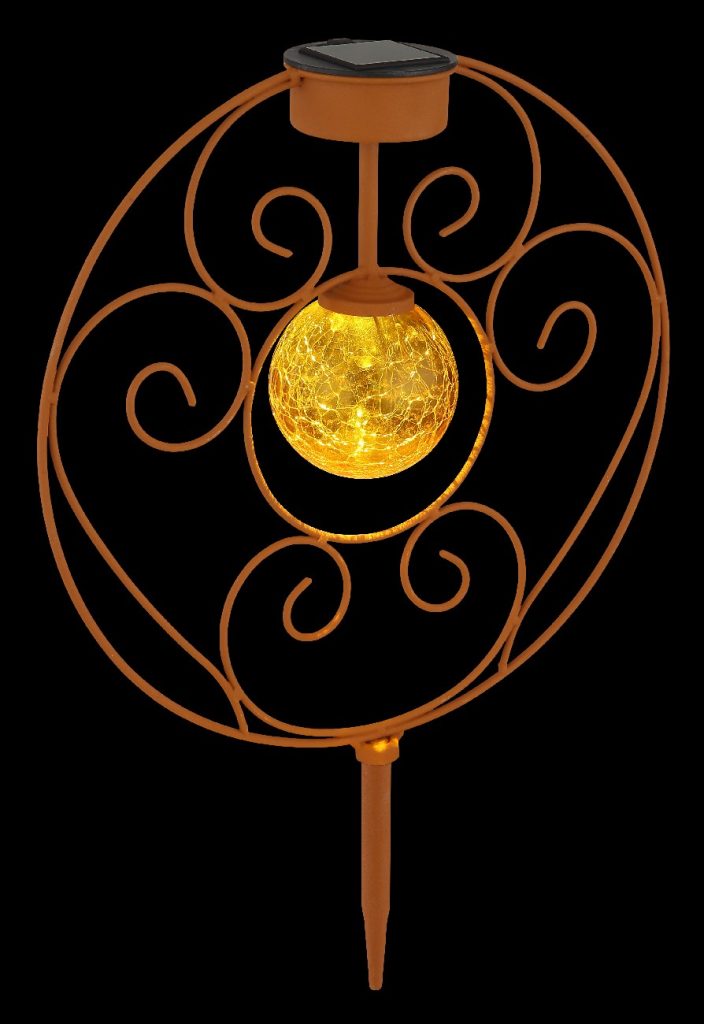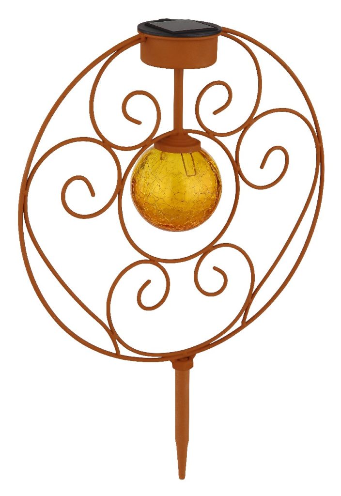 Ova prelepa spoljašnja solarna lampa u rđavim bojama inspiriše svojim sjajnim dizajnom. Ova lampa visoka 41 centimetar sastoji se od ravnog metalnog diska sa ukrasnim lukovima, prelepom staklenom kuglom i vrhom za uzemljenje. Topla bela svetlost od 3000 kelvina pruža prijatnu atmosferu i zaštićena je IP44 stepenom zaštite.