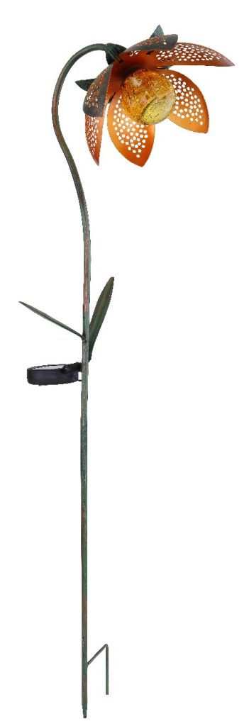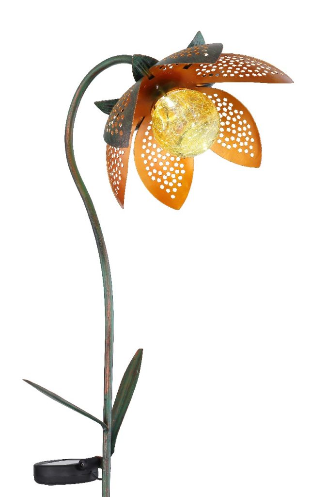 Ovaj solarni cvet visok skoro 1m napravljen je od metala (unutar zlatne boje, spolja zelene) i staklene kugle u boji ćilibara (Ø 6cm). Pravilno postavljena, ova oblikovana solarna lampa osigurava odlično osvetljenje do 8 sati (kada se u potpunosti napuni) i pravi prijatnu atmosferu.