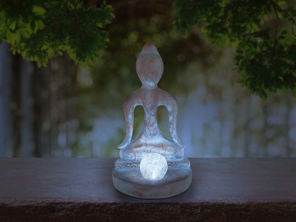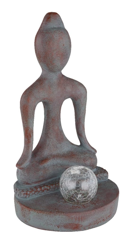 Ova velika solarna lampa inspiriše svojim prelepim dizajnom. Na okruglom postolju nalazi se Budina statua u bronzanoj i srebrnoj boji sa staklenom kuglom i ukupnom visinom od 30 centimetara, koja emituje 6000 Kelvina hladne bele svetlosti i tako pruža prijatnu atmosferu.