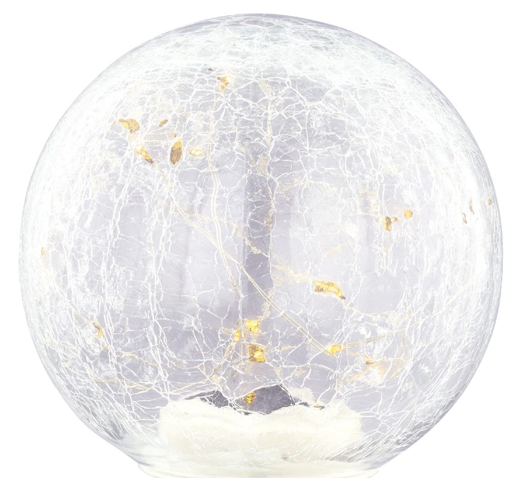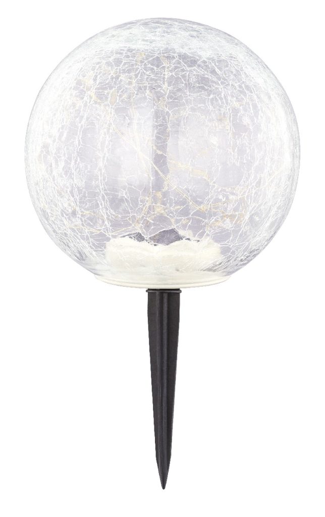 Ova romantična solarna kugla (Ø 150mm) pretvara vaš prostor baštu/terasu u mesto za opuštanje. Udobno toplo svetlo od 2700K je veoma efikasno kroz staklo koje izgleda kao da je napuklo. Zbog crnog plastičnog vrha na dnu lampe, položaj se može (uključujući bateriju) odlično prilagoditi. Kada je uključena, ova LED solarna lampa (15x 0.06W) osvetljava vašu baštu do 6 sati. Sa zaštitnom klasom IP44, ova lampa je idealna za upotrebu na otvorenom.