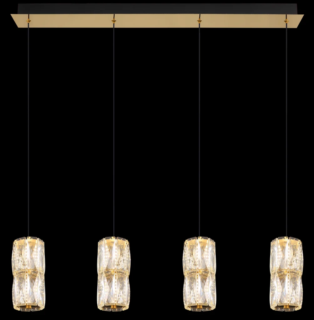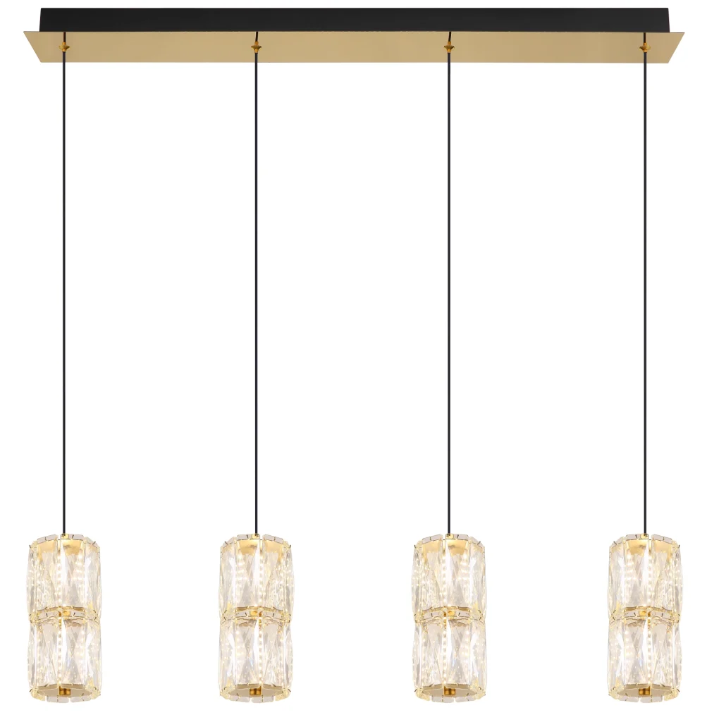 Viseća lampa STEFANIE sa četiri cilindrična abažura napravljena od providnih staklenih kristala unosi svetlost i eleganciju u svaku prostoriju. Metalno kućište u antičkoj zlatnoj nijansi i mat crnoj boji pruža moderan izgled. Sa dužinom od 845 mm i svetlosnim snagama od 2000 lumena, idealna je za velike trpezarije ili dnevne sobe. Topla bela temperatura boje od 3000 K stvara prijatnu atmosferu i poziva vas da se zadržite. Ova viseća lampa kombinuje estetiku i funkcionalnost i postavlja stilske akcente u vaš enterijer.