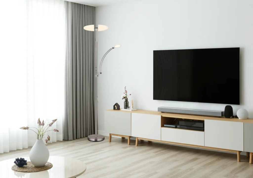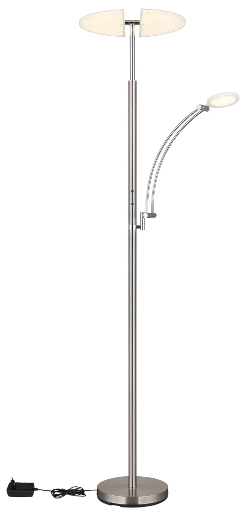 Moderna uzvodna lampa napravljena od mat nikla i hromiranog metala sa saten akrilom unosi stilski dizajn u vaš dom. Sa bezstepenim dodirnim dimerom, možete podesiti osvetljenost po svojoj želji i fiksirati boju. Funkcija memorije čuva vaša željena podešavanja. Uzvodna lampa je pokretna, može se rotirati i okretati za individualnu orijentaciju svetlosti. Sa veličinom od 800x405x1830 mm i dužinom kabla od 1800 mm, savršeno se uklapa u svaku prostoriju. Pored toga, uzvodna lampa ima svetlo za čitanje (prečnik: 12 cm) i isporučuje se sa LED sijalicama: 40W sa izvorom od 4000lm i izlazom od 2800lm, kao i 5,5W sa izvorom od 570lm i izlazom od 400lm, podesivim između 2700-6000K. Naručite ovu svestranu uzvodnu lampu danas i uživajte u optimalnom svetlu u svom domu.