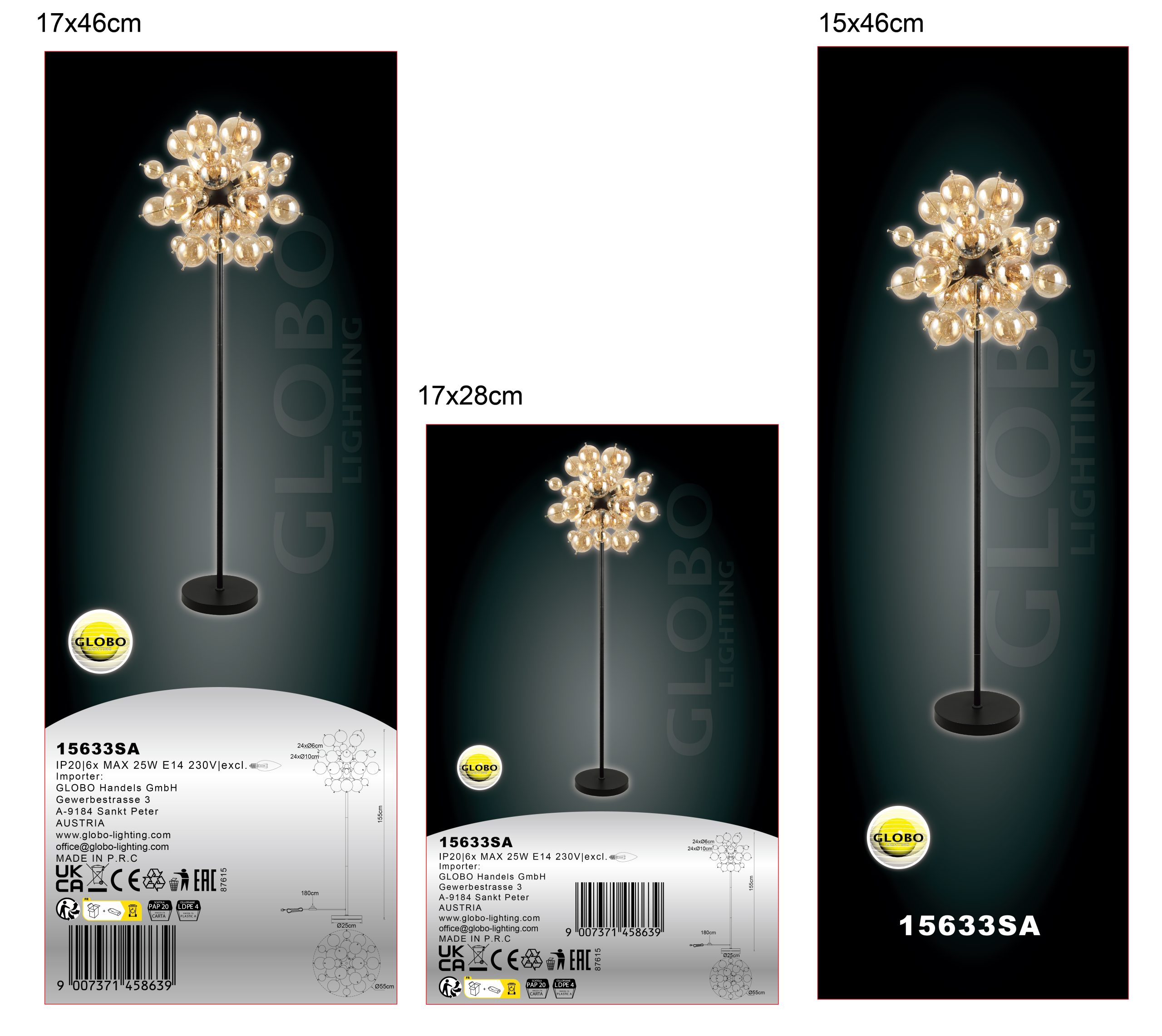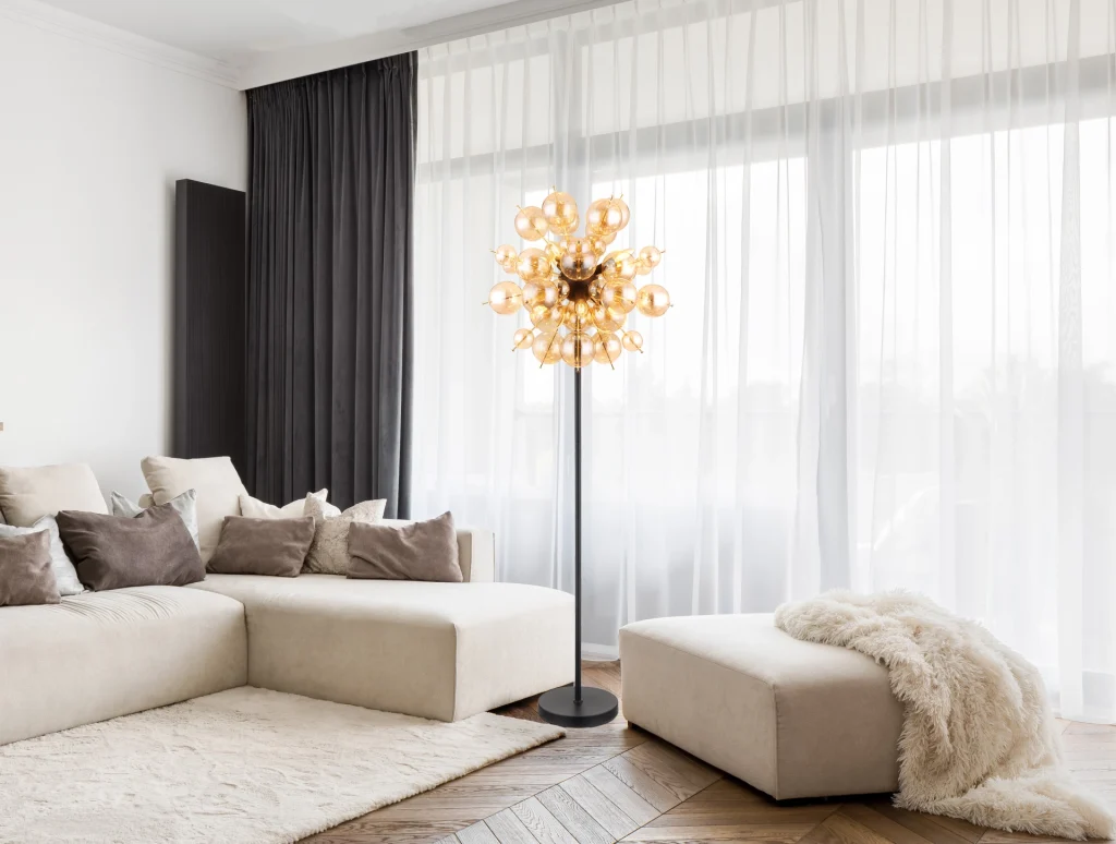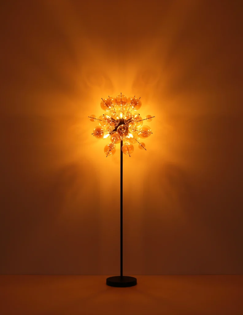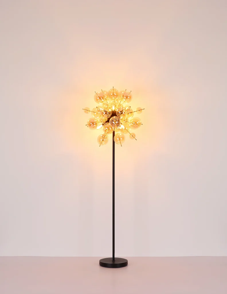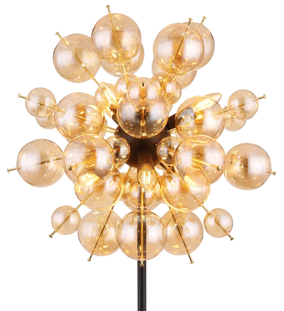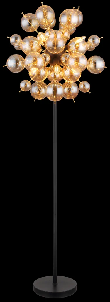 Podna lampa UDO kombinuje moderan dizajn sa notom ekstravagancije. Sa svojim okruglim i elegantnim izgledom, ona je prava atrakcija u svakoj prostoriji. Štapovi lampe su opremljeni kuglicama različitih veličina, što stvara zanimljiv i razigran izgled. Telo podne lampe UDO je napravljeno od mat crnog metala, dok su sfere na štapovima zlatne boje. Ova kombinacija daje lampi plemenit i stilski karakter. Abažur je napravljen od ćilibarnih staklenih sfera koje proizvode toplo i prijatno svetlo. Sa prečnikom od 550 mm, ova podna lampa je pravi vrhunac i postavlja stilski akcenat u svakoj prostoriji. Nožni prekidač na kablu olakšava paljenje i gašenje svetla bez potrebe za saginjanjem. Dajte svom životnom prostoru moderan i ekstravagantan dodir uz podnu lampu UDO. Uronite svoj dom u toplo i udobno svetlo i uživajte u jedinstvenoj atmosferi.