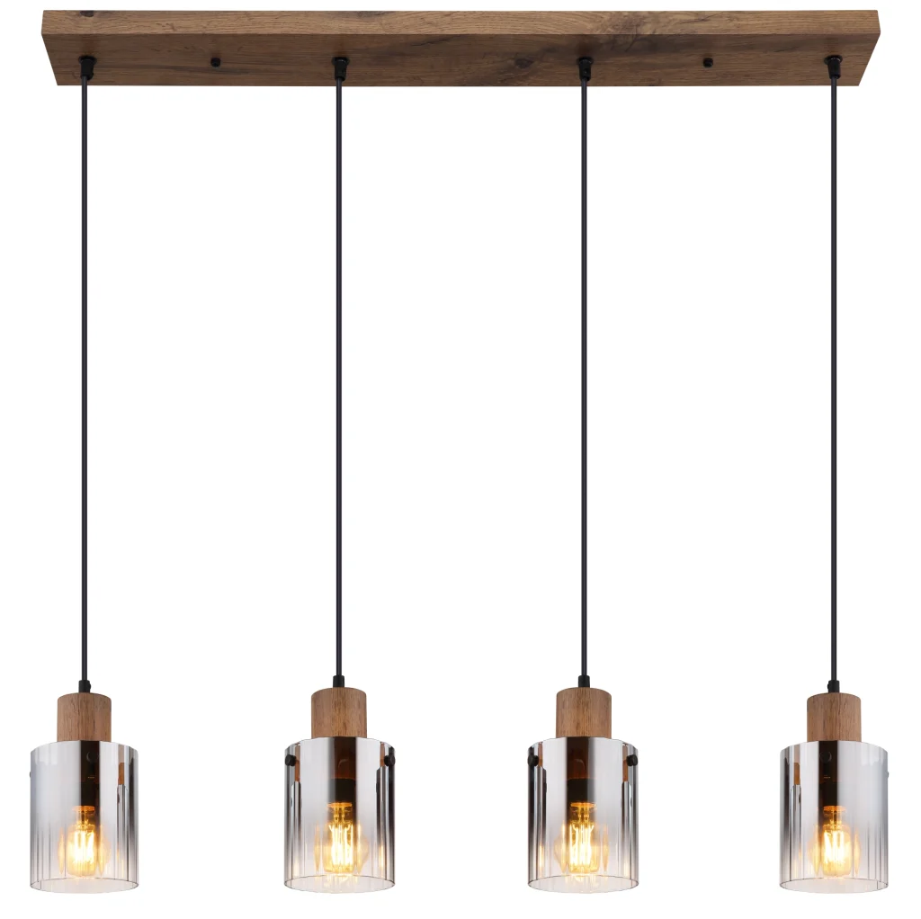 Viseća lampa UNDERWOOD impresionira svojim pravougaonim dizajnom i četiri stilska cilindra od providnog stakla. Kućište od MDF-a u tamnom drvenom izgledu pruža rustični izgled. Pogodna za E27 sijalice (ekskluzivno).