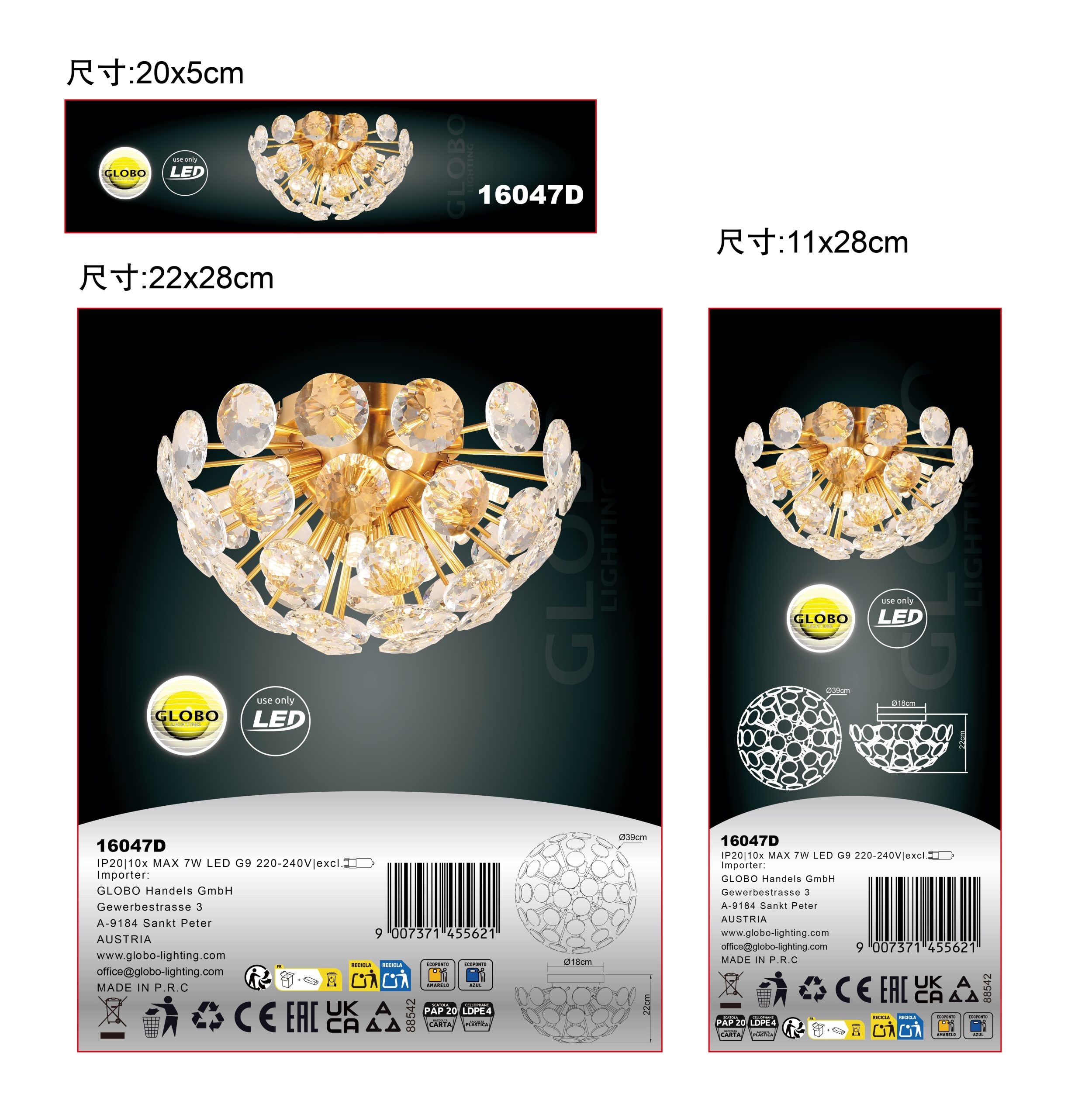 Polukružna plafonska lampa sa providnim K9 kristalima je prava atrakcija u svakoj prostoriji. Sa dizajnerskim telom napravljenim od metala zlatne boje i abažurom od providnih kristala, ova plafonska lampa će dodati dašak elegancije i luksuza vašem domu. Deset G9 grla omogućavaju svetlo i ravnomerno osvetljenje, dok jasan sjaj kristala stvara glamuroznu atmosferu. Sa prečnikom od 390 mm, ova plafonska lampa je idealna za veće prostorije i stvara blistavu igru svetlosti na plafonu. Dodajte elegantne akcente svom životnom prostoru ovom polukružnom plafonskom lampom od metala zlatne boje i providnih K9 kristala i uživajte u blistavom ambijentu koji stvara. Ova plafonska lampa nije samo izvor svetlosti, već i stilska dekoracija za vaš dom.