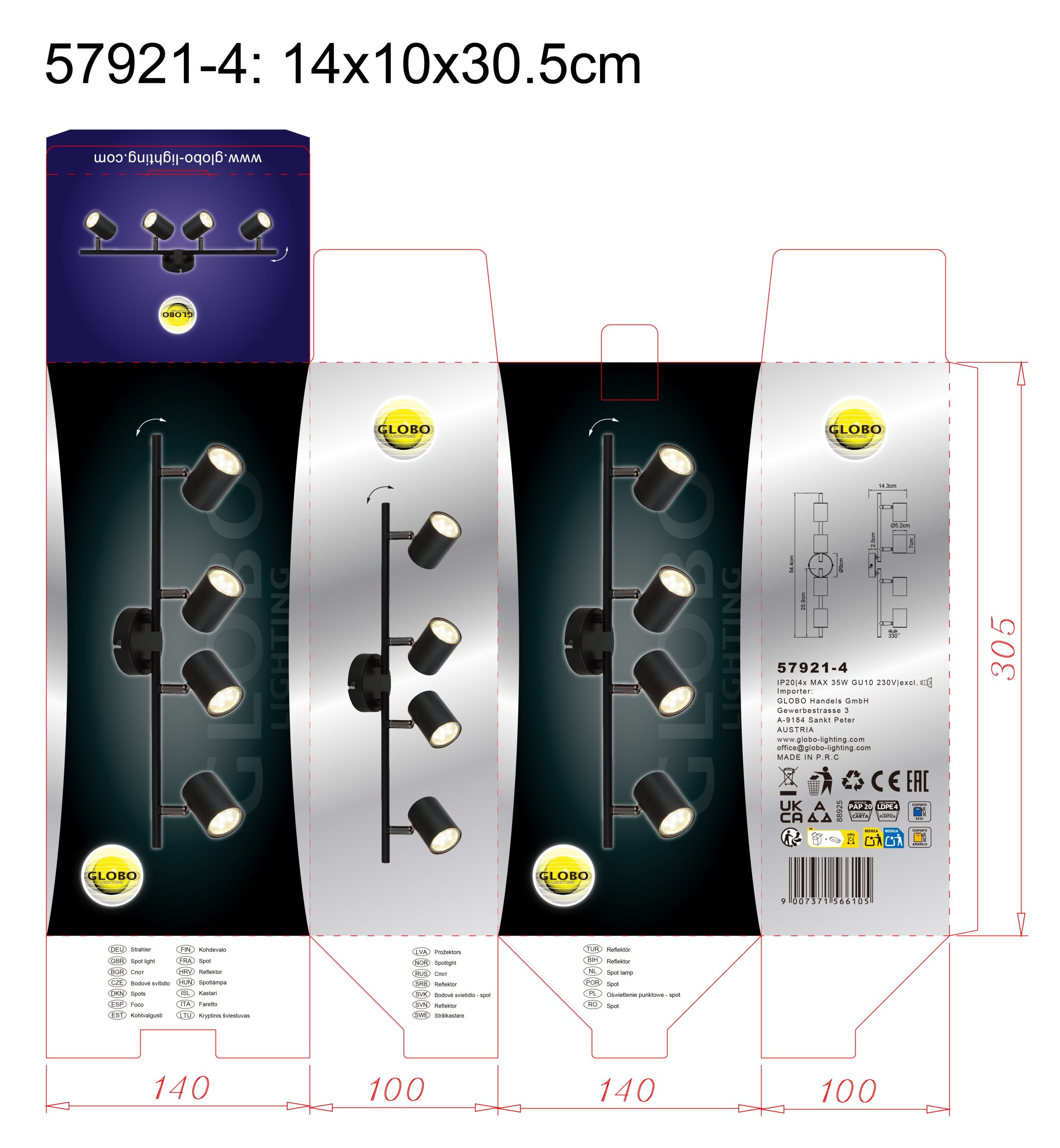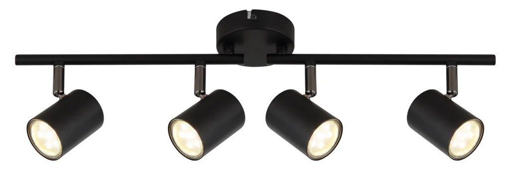 Metalni crni mat reflektor kombinuje moderan dizajn sa praktičnom funkcionalnošću. Sa dva ravna kraka i četiri pokretna cilindrična reflektora, ovaj reflektor nudi fleksibilno rešenje za osvetljenje koje se može savršeno prilagoditi različitim potrebama prostorije. Crno, mat metalno i plastično kućište se besprekorno uklapa u savremene enterijere i stvara elegantan izgled. Svaki reflektor se može pojedinačno poravnati tako da se mogu podesiti ciljani akcenti osvetljenja. Opremljen sa četiri GU10 grla (abažuri nisu uključeni), možete opremiti reflektor svojim omiljenim LED lampama kako biste postigli savršenu osvetljenost i boju svetlosti. Sa svojim minimalističkim dizajnom i velikom fleksibilnošću, ovaj reflektor je idealan za dnevne sobe, hodnike ili kancelarije. Pruža moderno i funkcionalno osvetljenje koje impresionira u svakoj prostoriji.