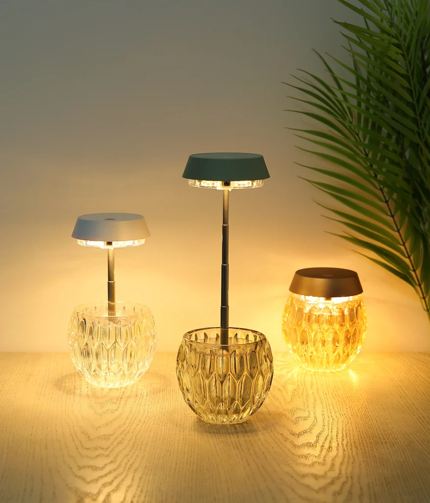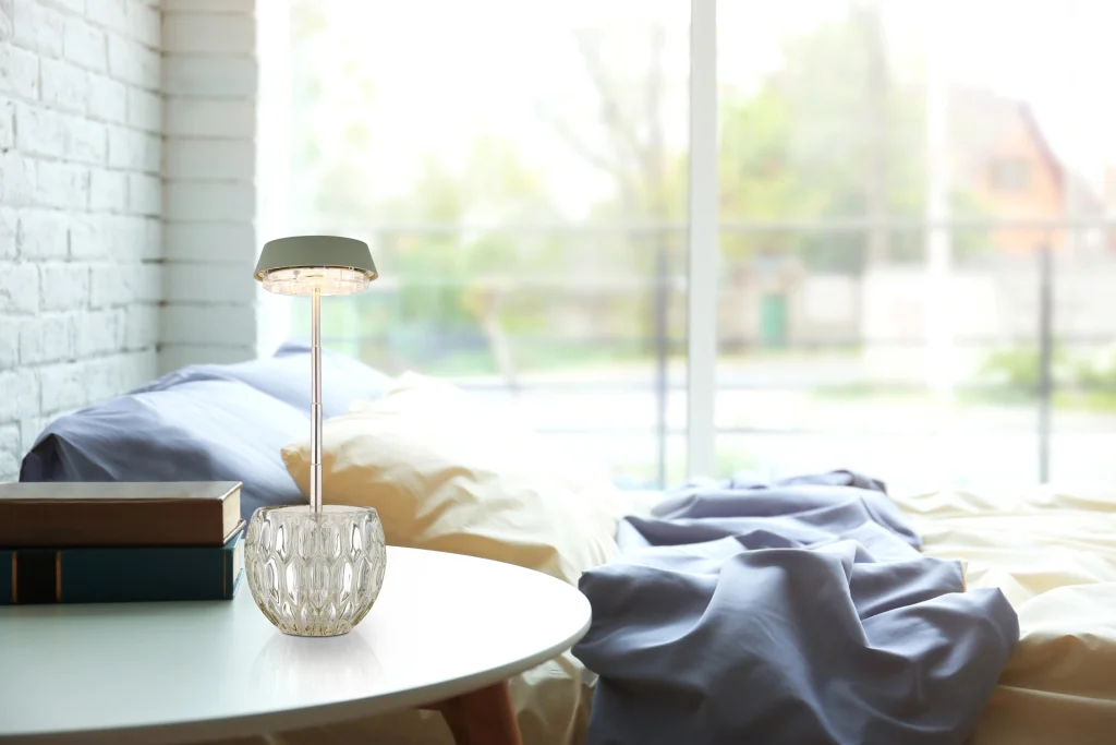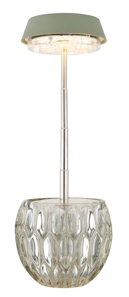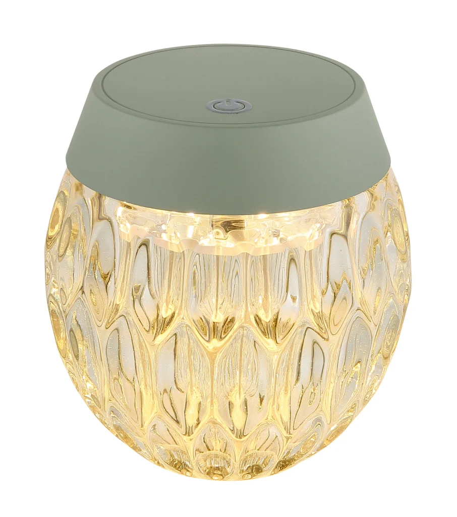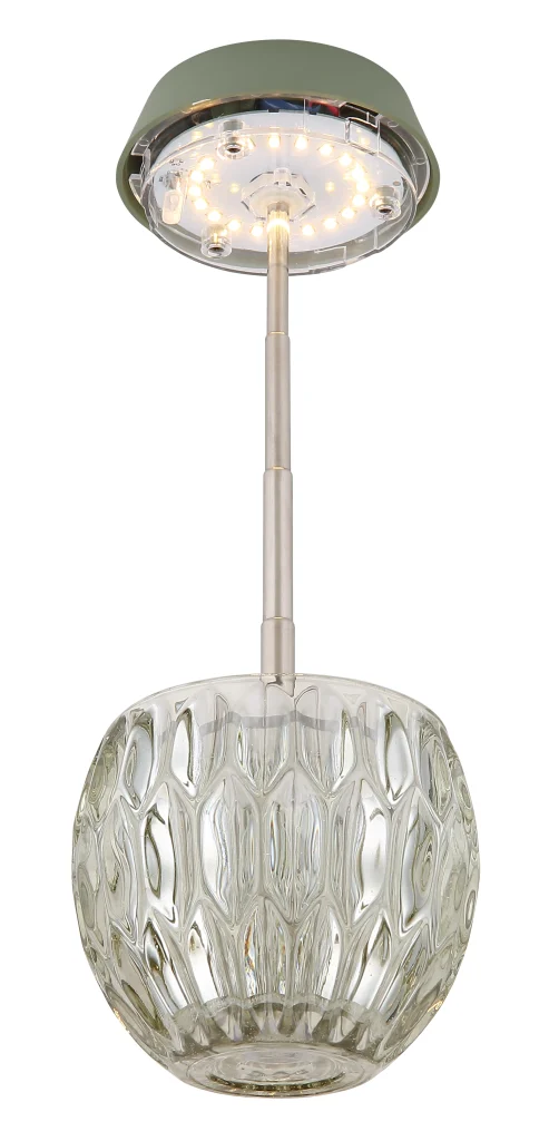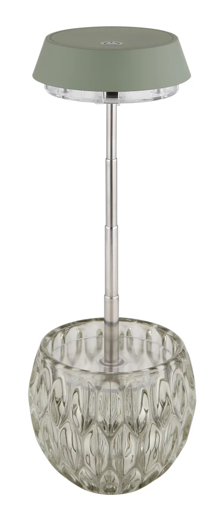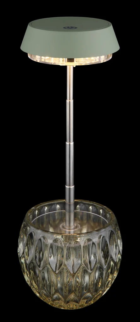 Stona lampa WANDA impresionira svojim modernim dizajnom i dobro osmišljenim funkcijama. Okruglo telo od zelenog stakla i nerđajućeg čelika unosi sveže akcente u svako životno okruženje. Abažur od mat, bledozelene plastike sa jasnim akcentom harmonično dopunjuje stilski izgled. Vrhunac je postolje u elegantnom kristalnom izgledu, koje lampi daje posebno elegantan dodir. Zahvaljujući integrisanom teleskopu, visina stone lampe se može fleksibilno podesiti, što omogućava širok spektar upotrebe. Stona lampa WANDA ima praktičan dodirni dimer koji vam omogućava da je lako uključite i isključite i praktično kontrolišete osvetljenost. Sa svetlosnim izlazom od 55 lumena i prijatnom bojom svetlosti od 3000 K, lampa pruža toplo i udobno svetlo. Vreme punjenja je približno 4 sata, dok je vreme osvetljenja približno 6 sati. Posebna prednost: svetlo se može nastaviti koristiti tokom punjenja. Uključeni USB kabl za punjenje omogućava lako punjenje, dok se adapter prodaje zasebno. Zahvaljujući integrisanoj LED tehnologiji, stona lampa WANDA se odlikuje visokom energetskom efikasnošću i dugim vekom trajanja.