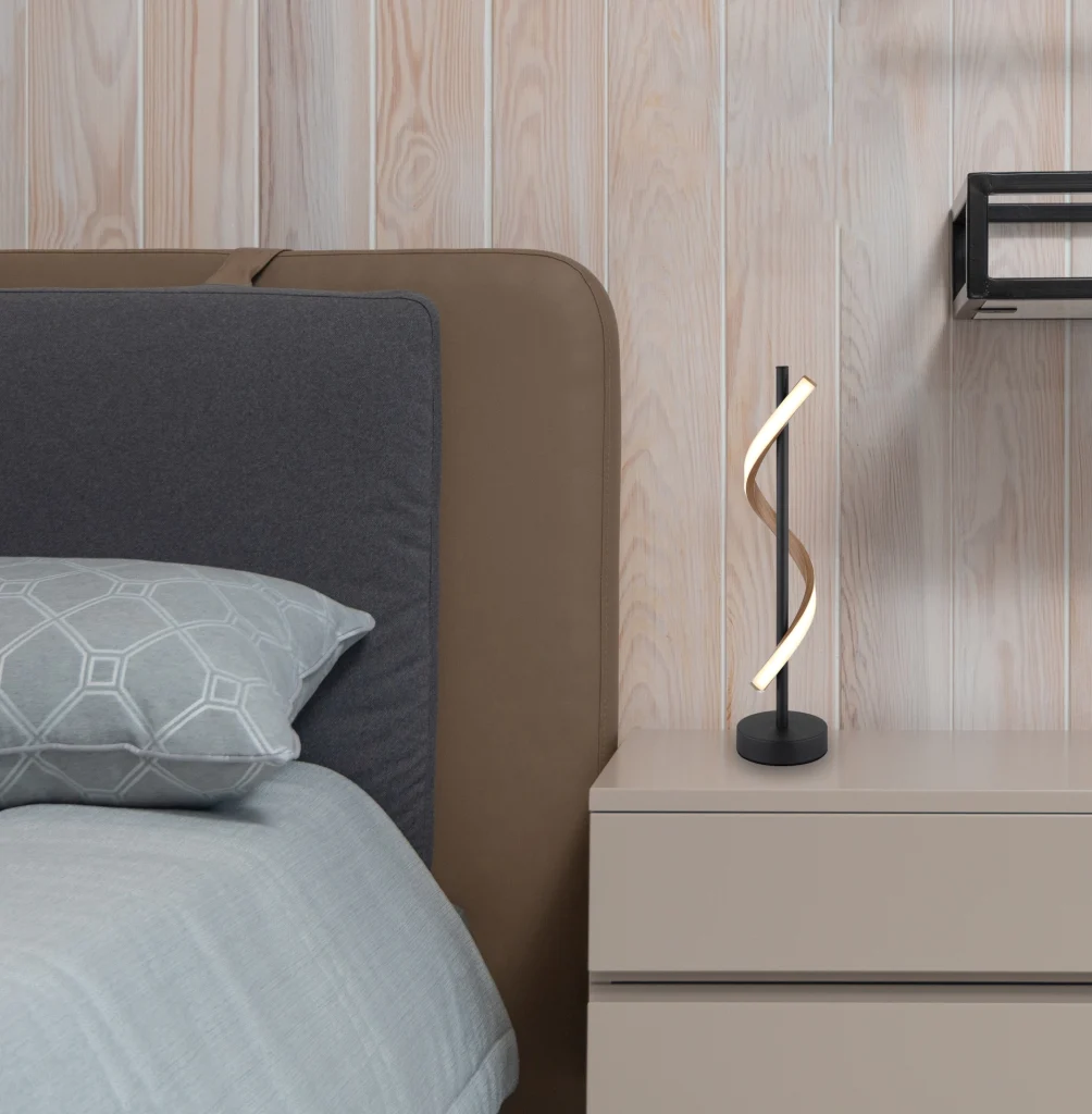 Stona lampa WATKINS kombinuje moderan dizajn sa funkcionalnom elegancijom. Okruglo telo od crnog, mat metala obavijeno je ravnom šipkom sa LED trakom. Abažur od aluminijuma sa izgledom drveta i opal plastike obezbeđuje nežnu i ravnomernu raspodelu svetlosti, što stvara prijatnu atmosferu. Sa prečnikom od 155 mm, lampa se savršeno uklapa na stolove, bočne stočiće ili noćne stočiće. Temperatura boje od 3000 K stvara toplo, privlačno svetlo – idealno za ugodne večeri ili kao praktično radno svetlo. Zahvaljujući prekidaču na kablu, svetlo se može lako uključiti i isključiti. Integrisana LED tehnologija garantuje dug vek trajanja i visoku energetsku efikasnost. WATKINS je savršen izbor za one koji traže stilski i funkcionalan dodatak za osvetljenje.