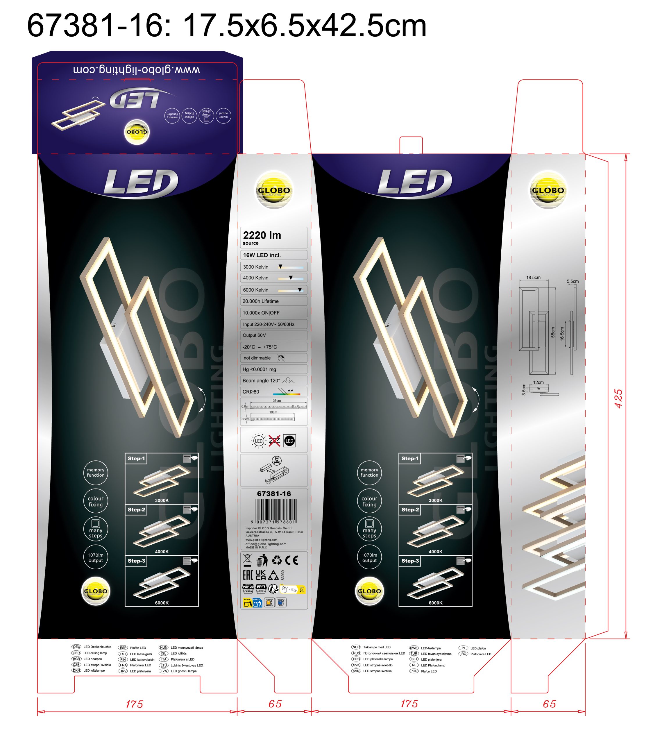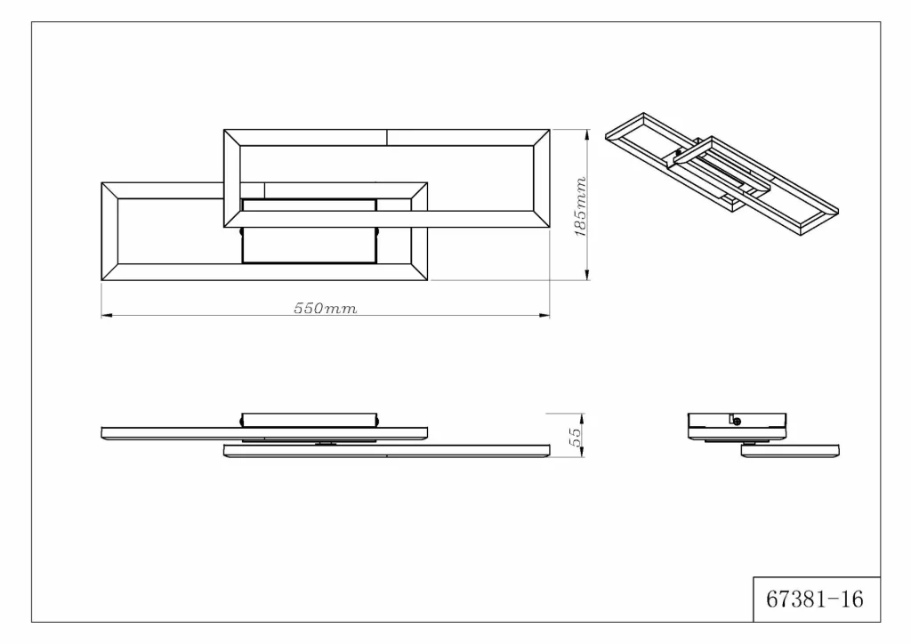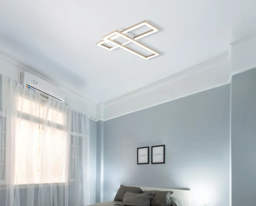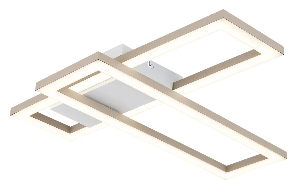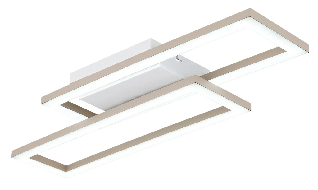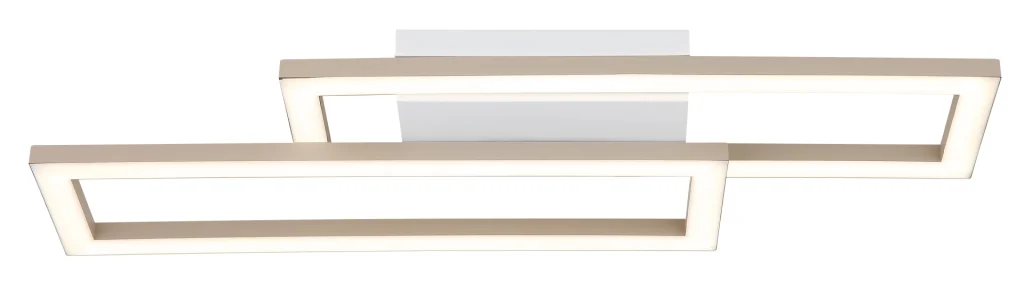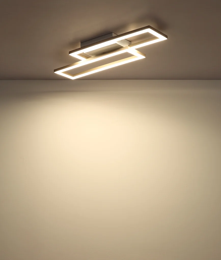 Plafonska lampa WILTON impresionira svojim modernim, geometrijskim dizajnom: dva pravougaona okvira postavljena između osovina stvaraju stilsku i dinamičnu strukturu osvetljenja. Okviri se mogu rotirati, što omogućava prilagođavanje poravnanja i fleksibilne aranžmane osvetljenja. Mat belo plastično kućište se savršeno usklađuje sa peščanim, mat i opal belim plastičnim abažurima – idealno za savremene životne ili radne prostore. Sa dimenzijama 550 x 155 mm i snagom od 1070 lumena, WILTON pruža prijatno, efikasno ambijentalno osvetljenje. Integrisana LED tehnologija je dugotrajna i energetski efikasna. Sa CCT funkcijom, temperatura boje se može fleksibilno podesiti između 3000 K (toplo bela) i 6000 K (hladno bela). Fiksne boje i funkcija memorije dodaju praktičnost čuvanjem poslednje izabranih podešavanja. WILTON je savršen izbor za one koji žele da kombinuju funkcionalnost sa stilskim dizajnom.