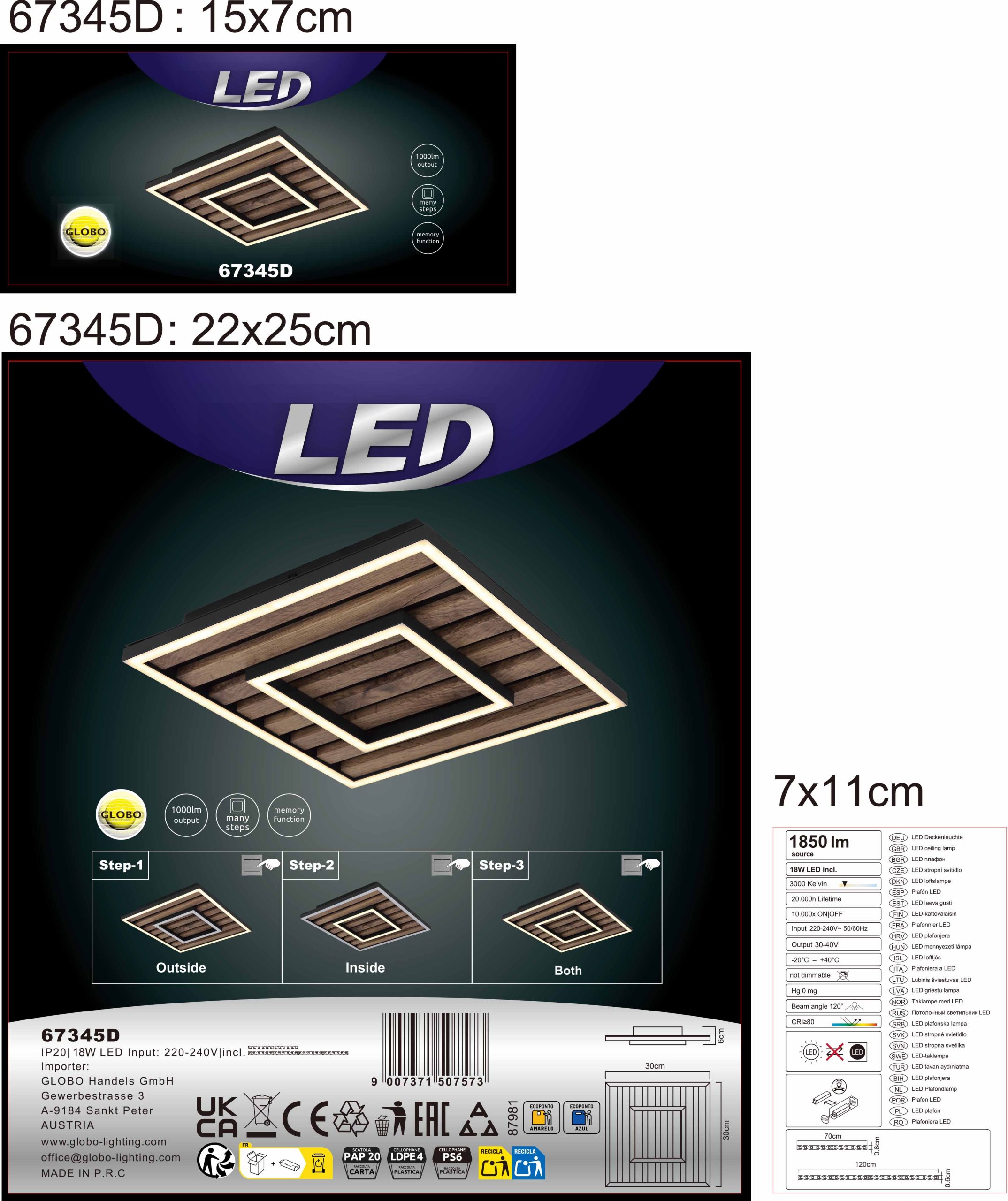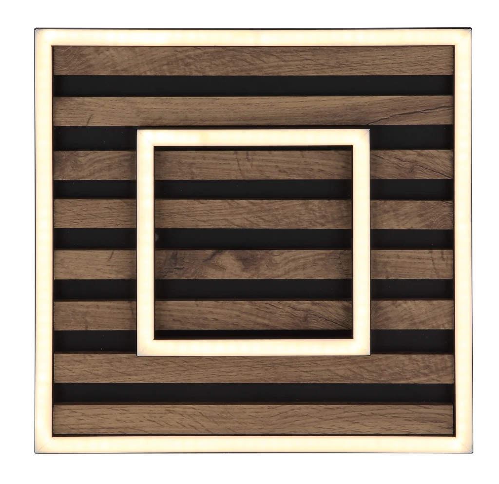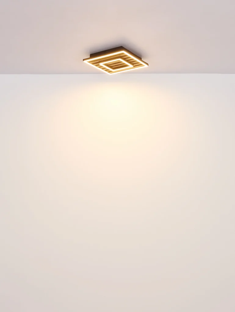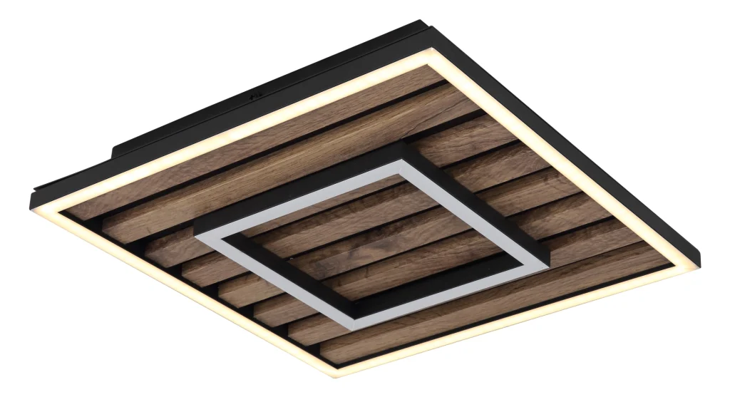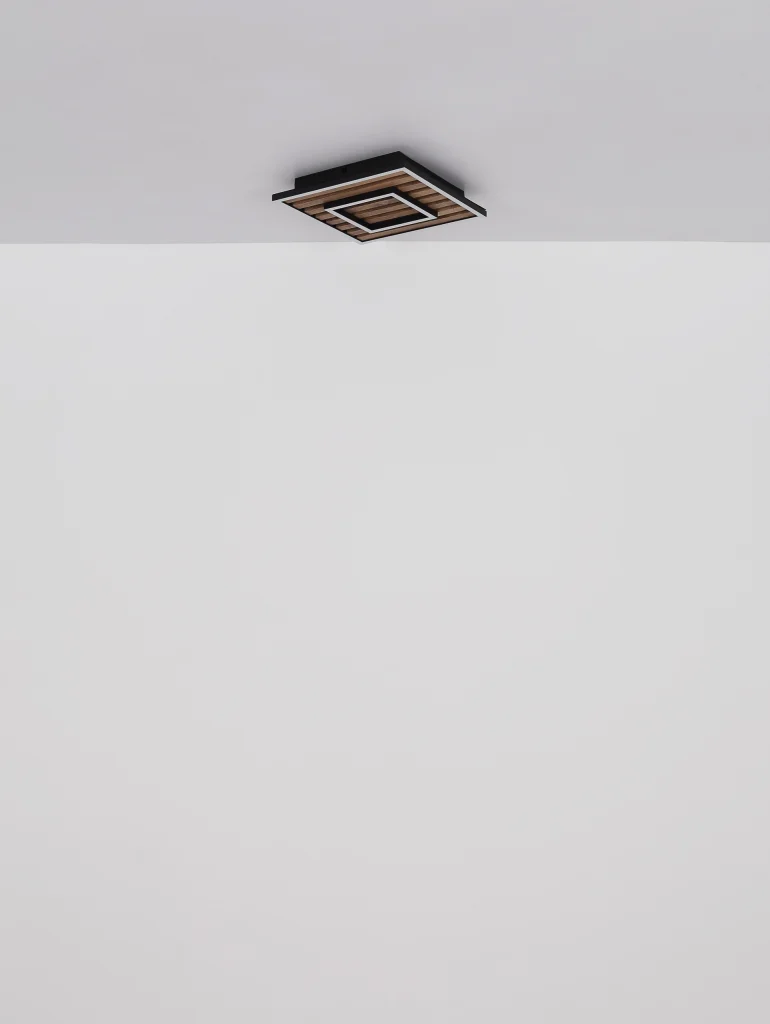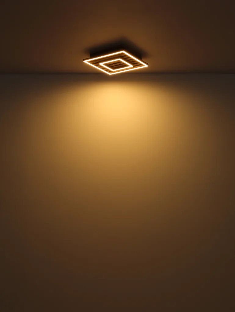 Ova plafonska lampa WOODY u modernom izgledu akustičnih panela kombinuje stilske materijale i inovativne funkcije. Telo je napravljeno od mat crnog metala, dok tamna MDF ploča sa izgledom drveta dodaje topao, prirodan dodir. Abažur od mat aluminijuma i opal plastike obezbeđuje ravnomernu raspodelu svetlosti. Svetiljka se može kontrolisati u nekoliko faza pomoću zidnog prekidača, nudeći tri različite opcije osvetljenja: spoljni okvir, unutrašnji okvir ili oba zajedno. Integrisana funkcija memorije čuva željena podešavanja. Opremljena LED modulom, svetiljka pruža svetlosni izvor od 1850 lm pri izlazu od 1000 lm i prijatnu temperaturu boje od 3000 K u toplo beloj boji.