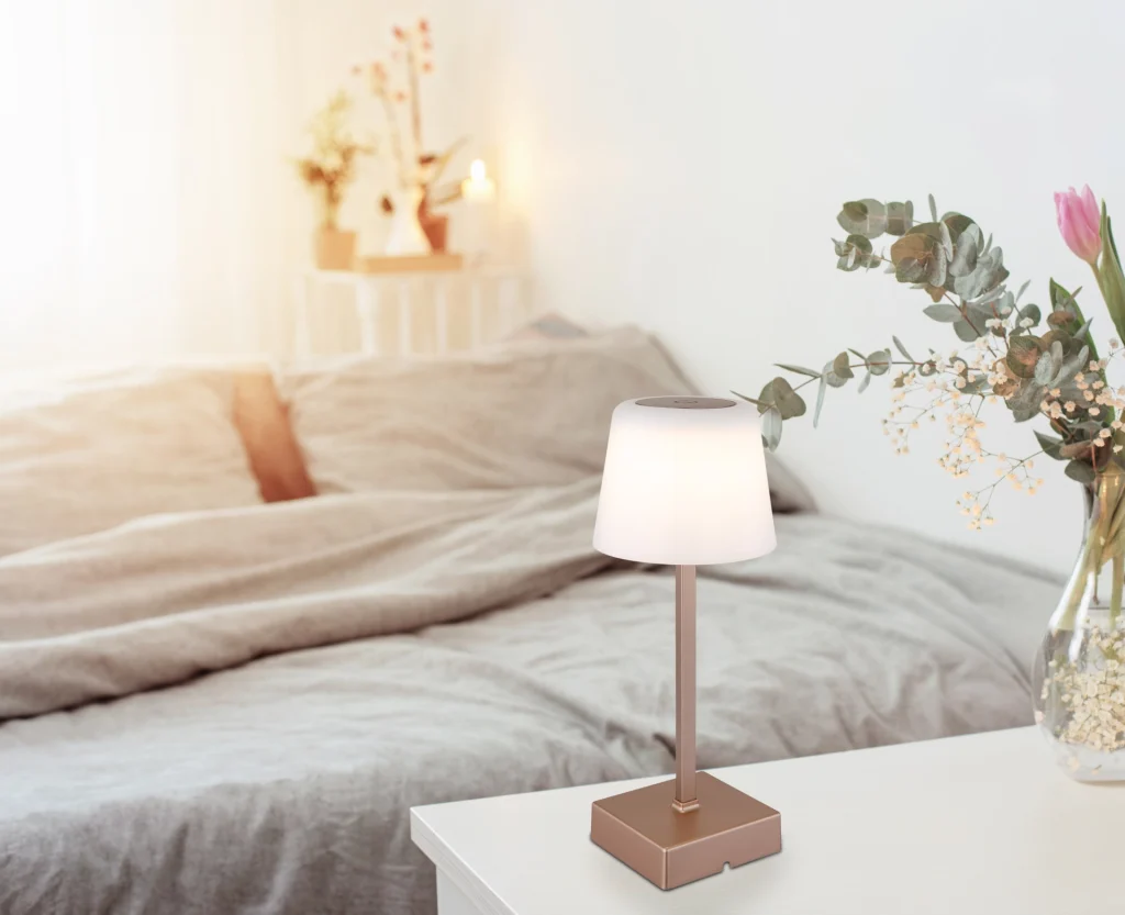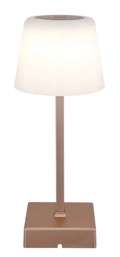Stona lampa XAYDEN impresionira svojim modernim dizajnom i raznovrsnim funkcijama. Sa okruglim abažurom od opal plastike i kvadratnom osnovom od elegantne mat plastike boje šampanjca i aluminijuma, ona je stilski dodatak svakoj prostoriji. Zahvaljujući bezstepenom dodirnom dimeru, možete pojedinačno podesiti osvetljenost, a temperatura boje je promenljiva od 3000K do 6000K kako bi se stvorilo željeno raspoloženje osvetljenja. Pored toga, boja svetlosti se može fiksirati tako da željena atmosfera ostane trajna. XAYDEN ima praktičan dodirni prekidač za uključivanje/isključivanje, kao i USB kabl za punjenje koji omogućava punjenje za oko 4 sata. Sa vremenom rada do 6 sati, LED svetlo pruža dugotrajno osvetljenje. Kompaktna veličina sa prečnikom od 85 mm i izlaznom snagom od 106 lumena čini XAYDEN fleksibilnim i svestranim izvorom svetlosti koji pruža prijatno osvetljenje u svakoj prostoriji.