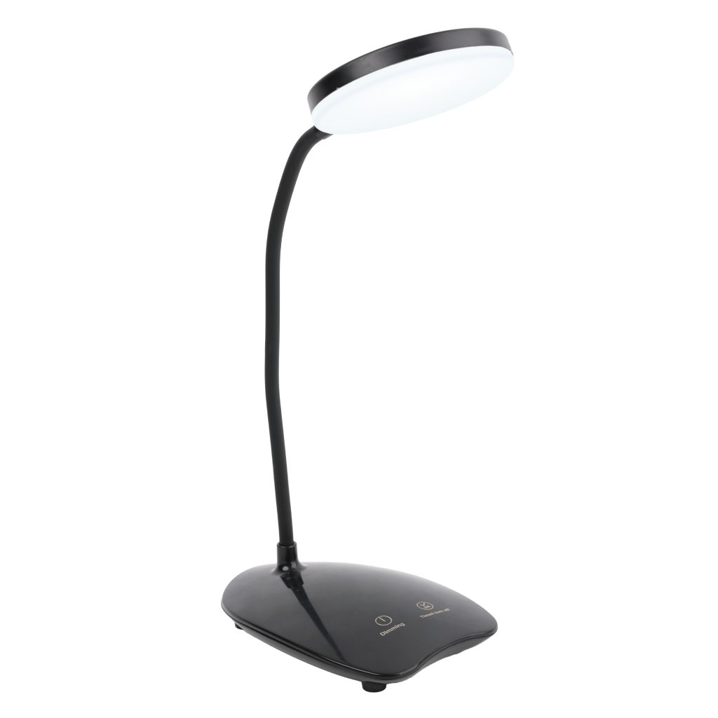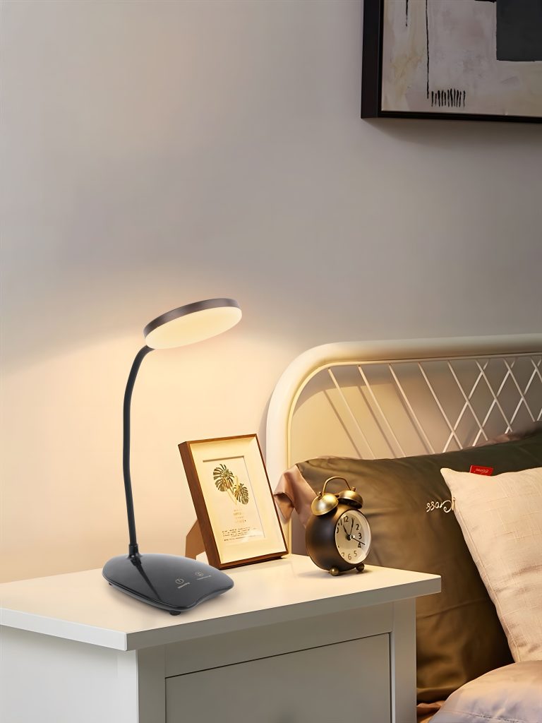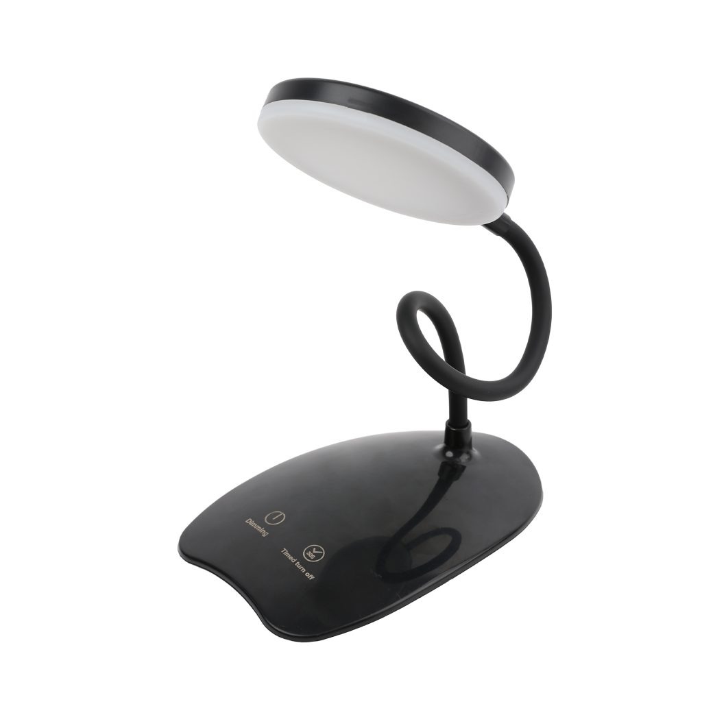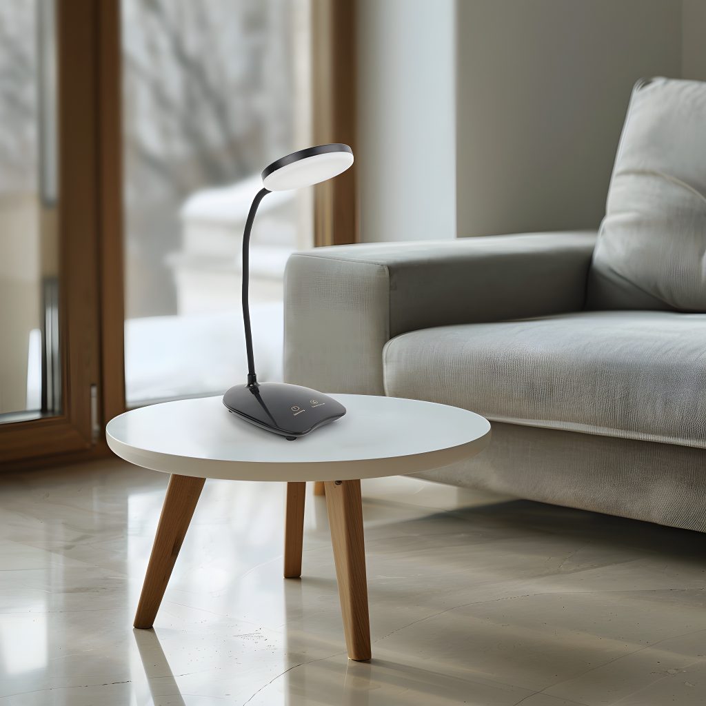 Stona lampa ZOE kombinuje funkcionalnost, moderan dizajn i fleksibilnost u kompaktnom formatu. Njen okrugli, ravni abažur nalazi se na fleksibilnom nosaču koji se može individualno podesiti – savršena je za čitanje , rad ali i kao ambijentalno osvetljenje. Crno plastično kućište savršeno se uklapa u svako životno ili radno okruženje. Opremljena je integrisanom LED tehnologijom, osetljiva je na dodir. Temperatura boje se može podesiti od toplo bele 3000K do hladno bele 6500K. Idealna je za radne stolove, noćne stočiće ili kao funkcionalni dekorativni element u dnevnom boravku.